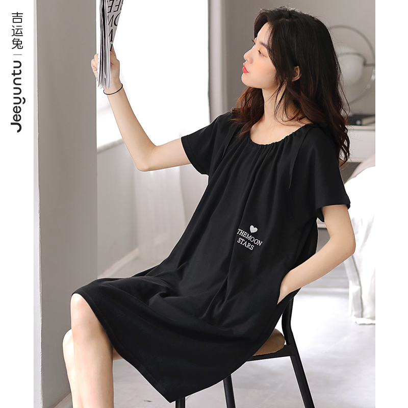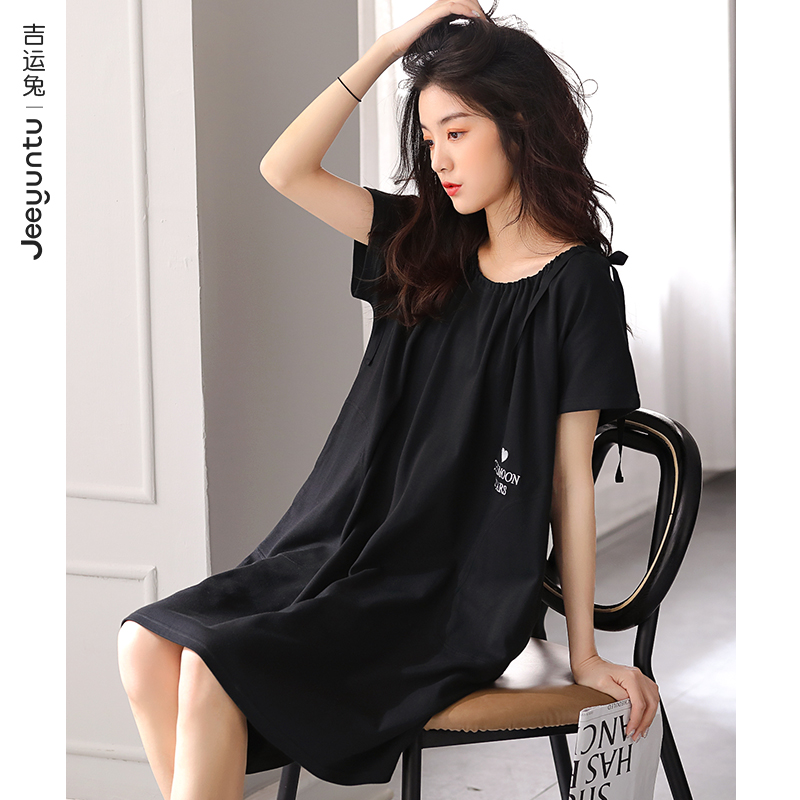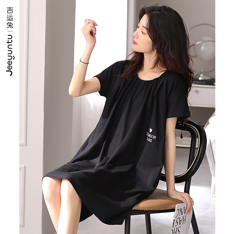 Sleeping Skirt Woman Summer 2022 New Advanced Senses Summer Thin medium long version pure cotton black short sleeve large size pyjamas
