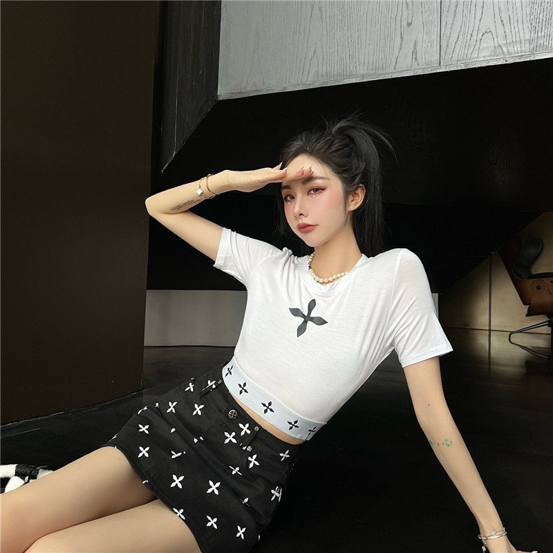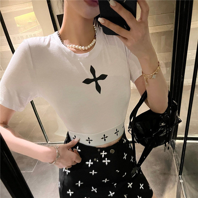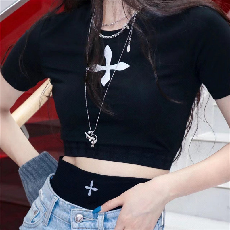 Cross flower short-sleeved T-shirt women's 2022 summer new white short section slim slim hot girl sexy top tide brand