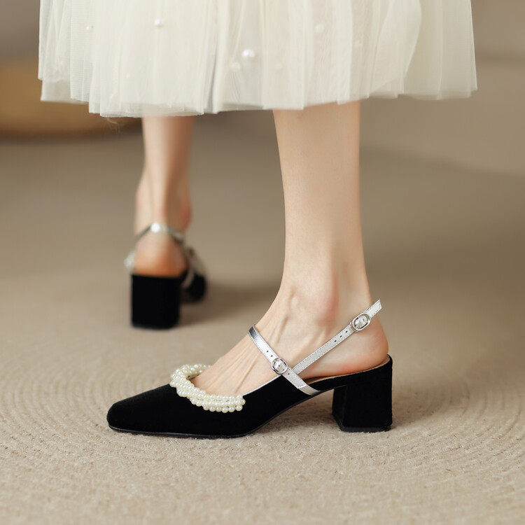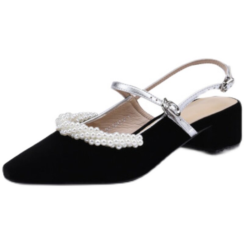 Baotou leather sandals women's 2022 summer new Korean version pearl all-match one-word buckle belt thick heel niche high heels