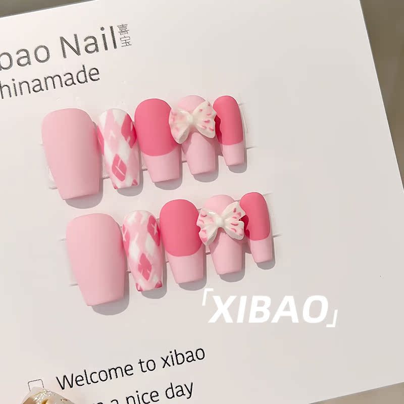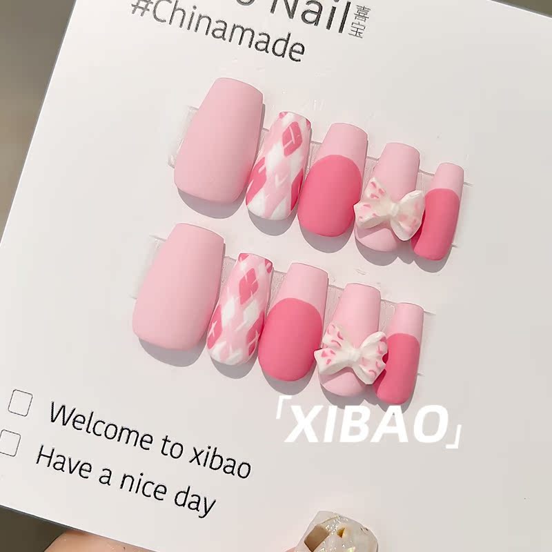 Finished nail art wearable high-end handmade custom-made wearable pink bow rhombus nail patch - Taobao