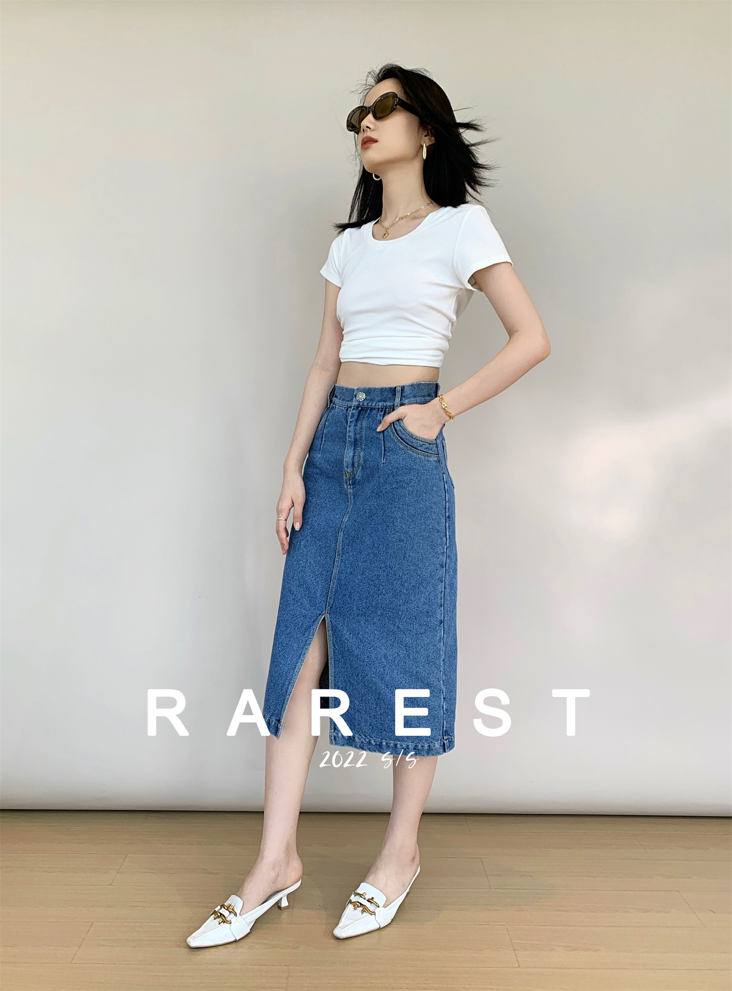 RAREST independent design Turkey imported color line modern front slit denim skirt over the knee midi skirt