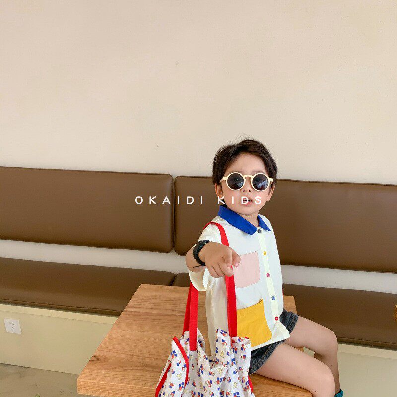 OKAIDI French boys and girls shirts short-sleeved children's summer lapel color-blocking shirt baby Korean casual top