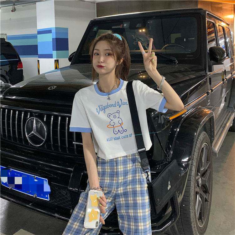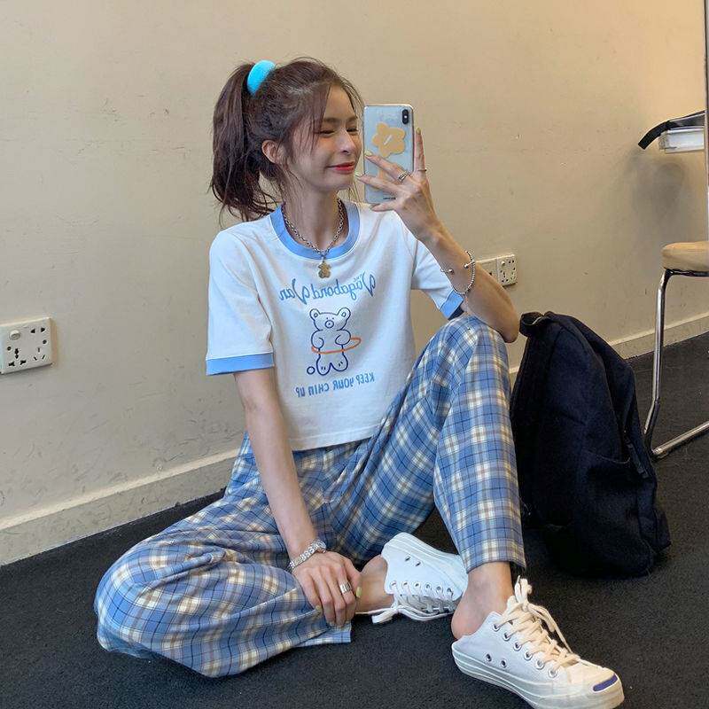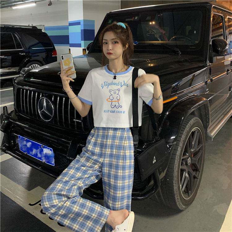 Single suit summer suit new student Korean version loose short T-shirt female plaid casual wide-leg straight-leg pants two-piece set