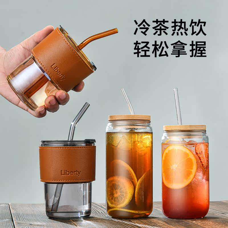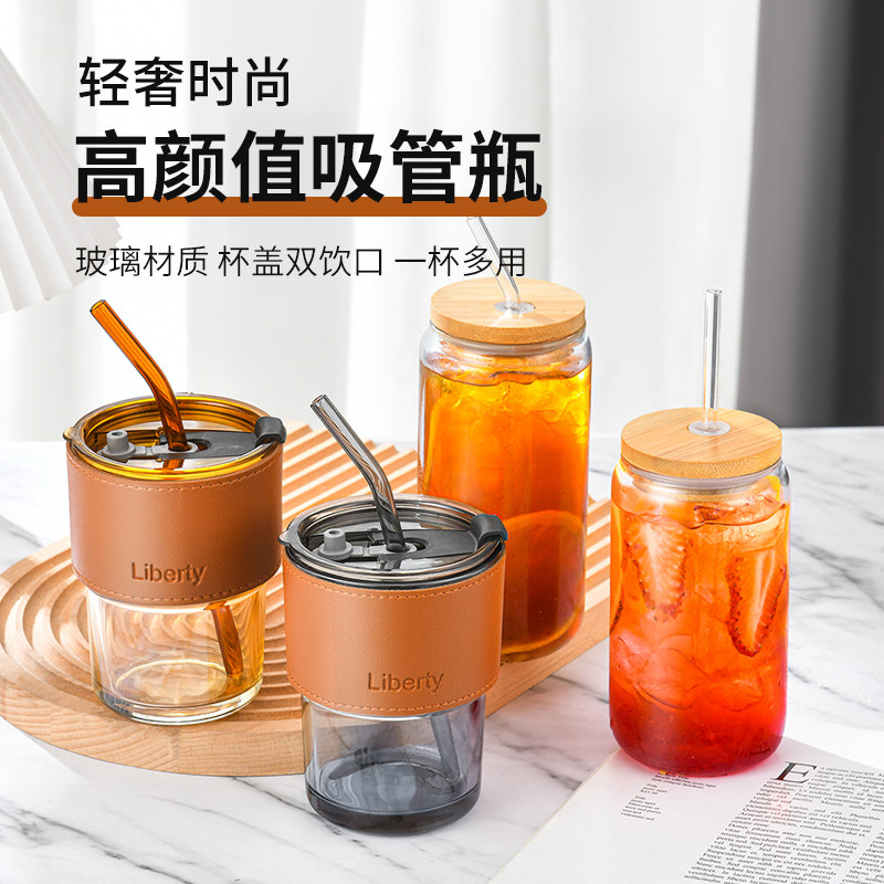 Colorful high-value amber northern lights retro bamboo fashion high temperature resistant covered glass drinking straw cup coffee cup