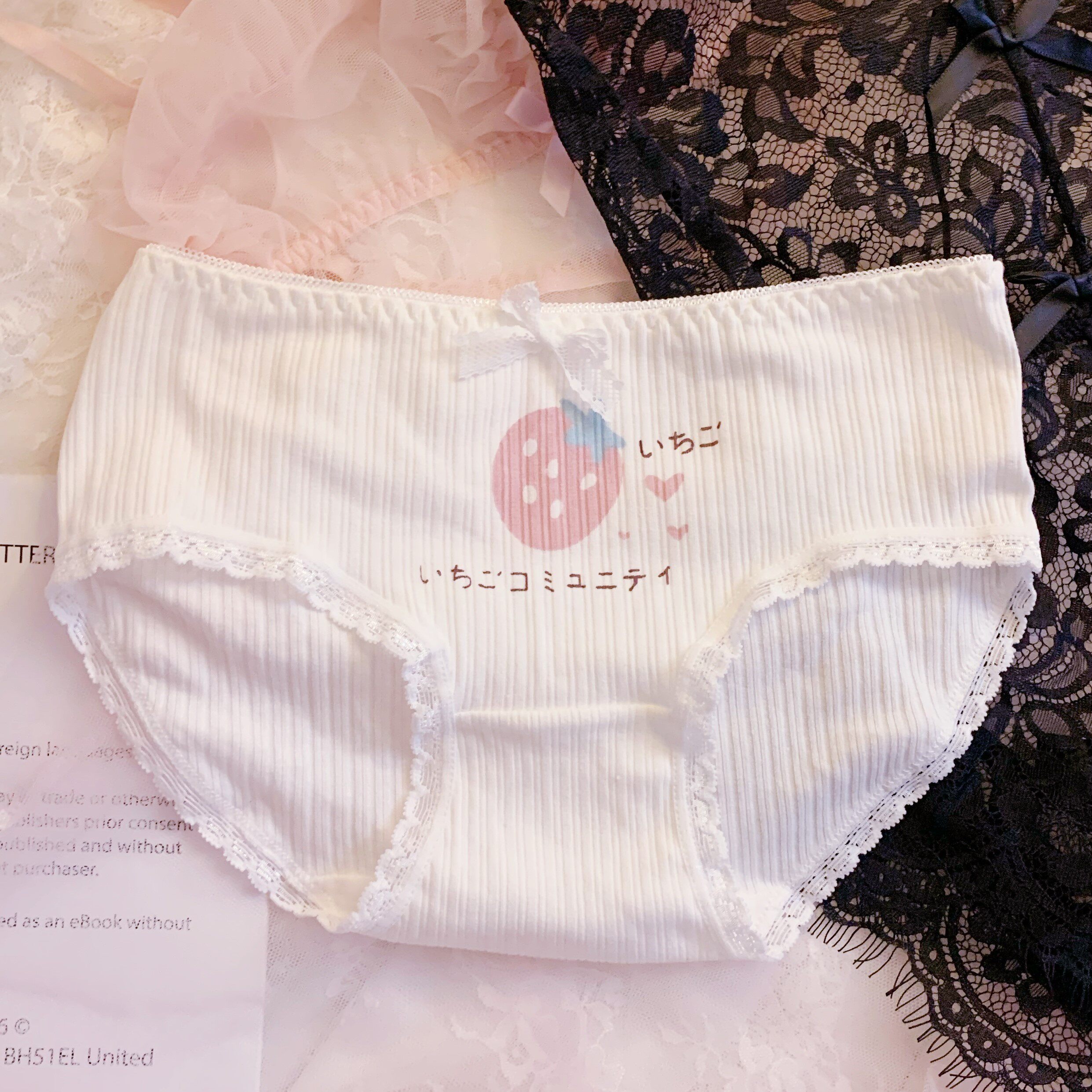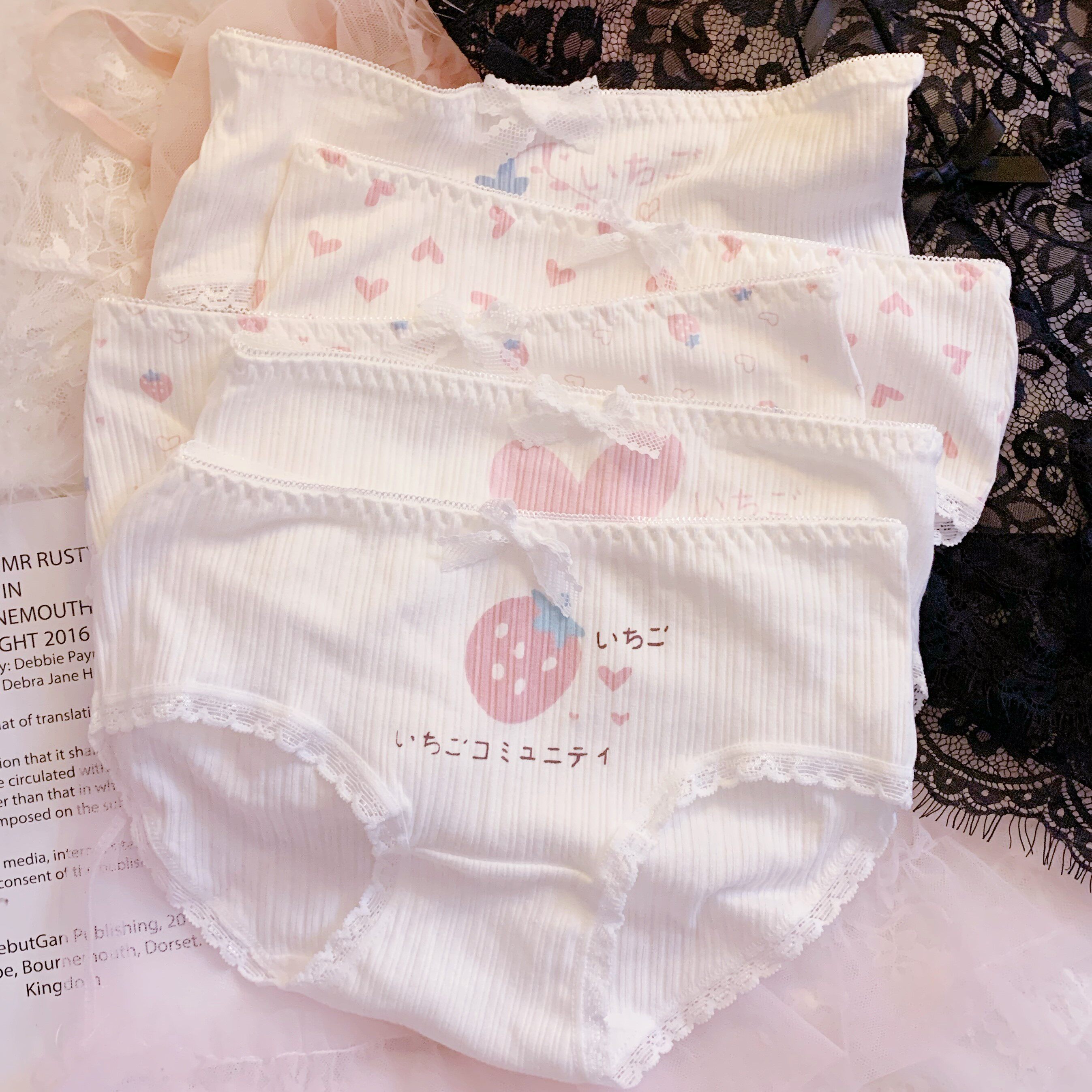 Strawberry loving (picture pure cotton 5 strips) pink strawberries (in pure cotton 5 strips) clear white (as in pure cotton 5 strips) pink cat paws (in pure cotton 5 strips) Christmas strawberry flat