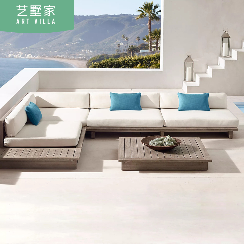 High-end outdoor teak sofa open-air villa hotel courtyard solid wood sofa coffee table combination sunscreen and rainproof sofa