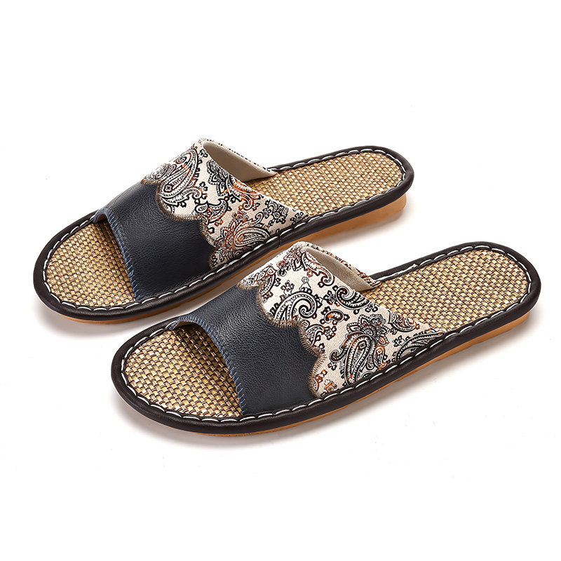Eurostyle genuine leather linen sandals women Summer non-slip Deodorant Suction sweat Home Indoor Cow Leather Slippers for Men's Soft Bottom