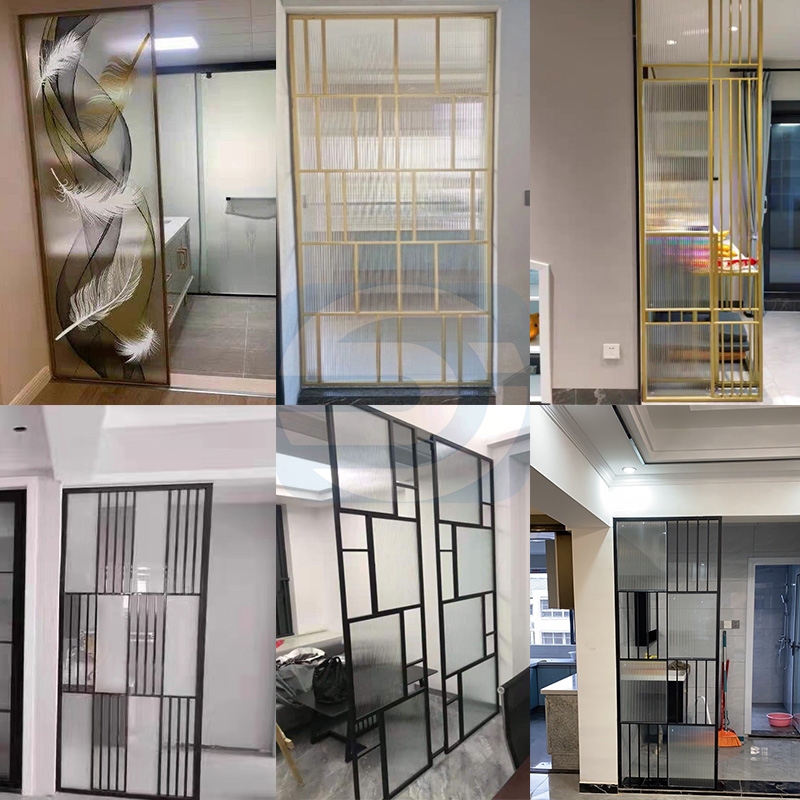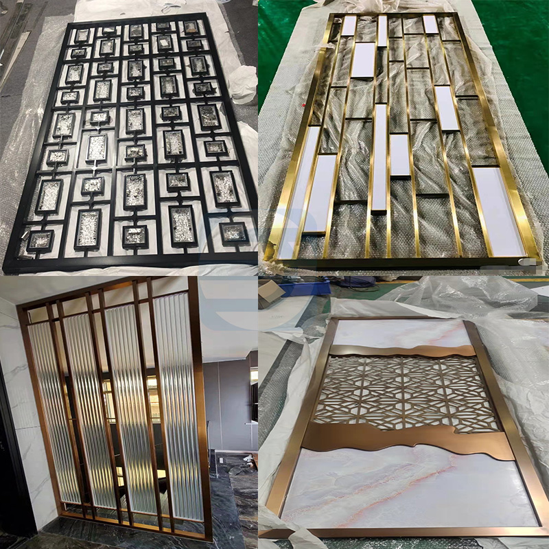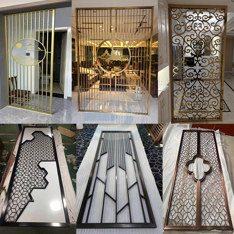Light luxury stainless steel glass screen partition custom titanium alloy laser hollow living room lattice new Chinese metal porch