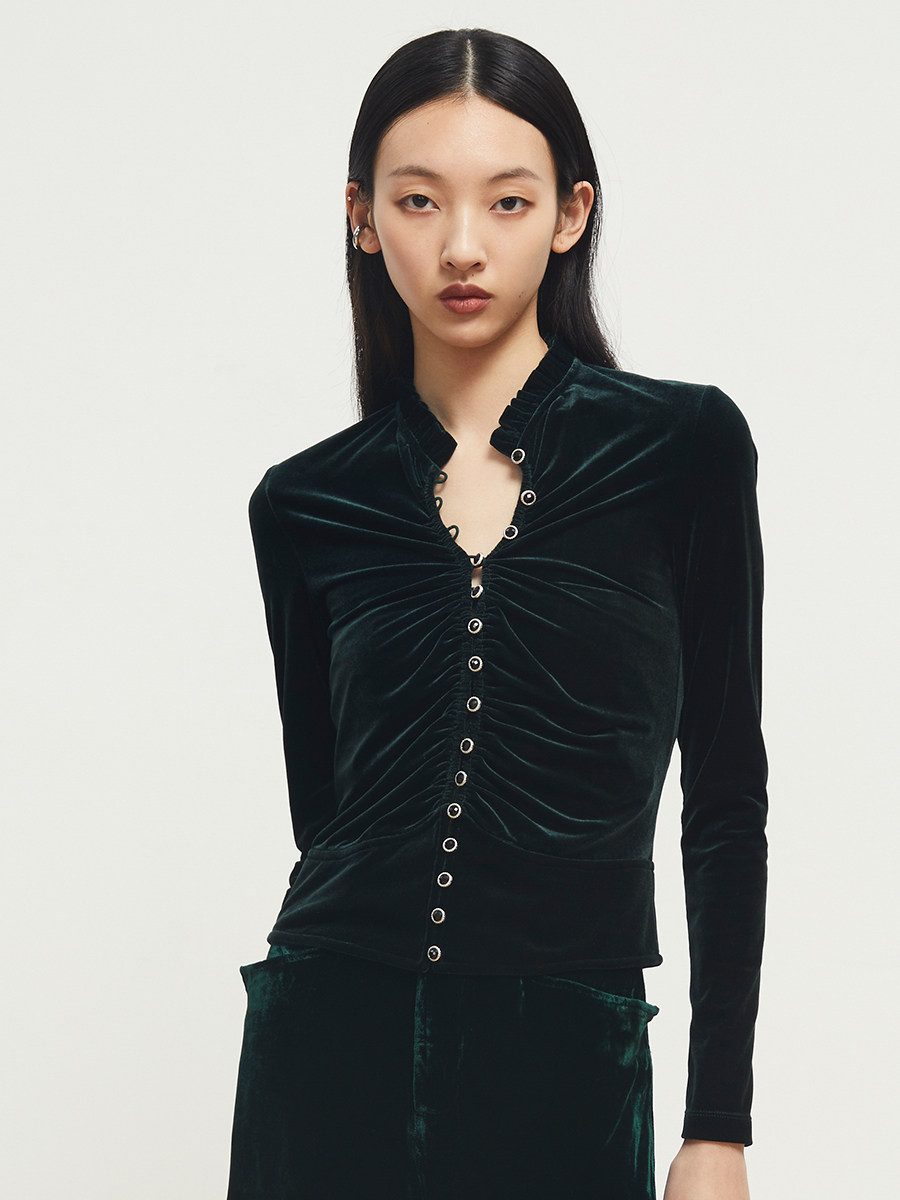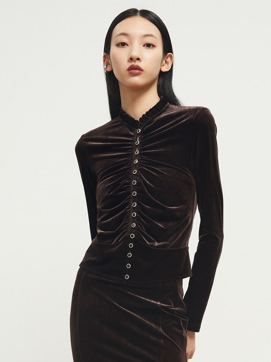 Boss Z's retro court style self-cultivation and charming texture long-sleeved women's three-dimensional tailoring Korean velvet retro top women