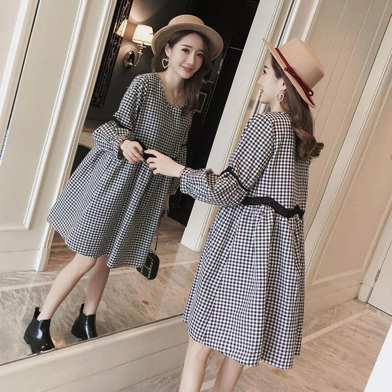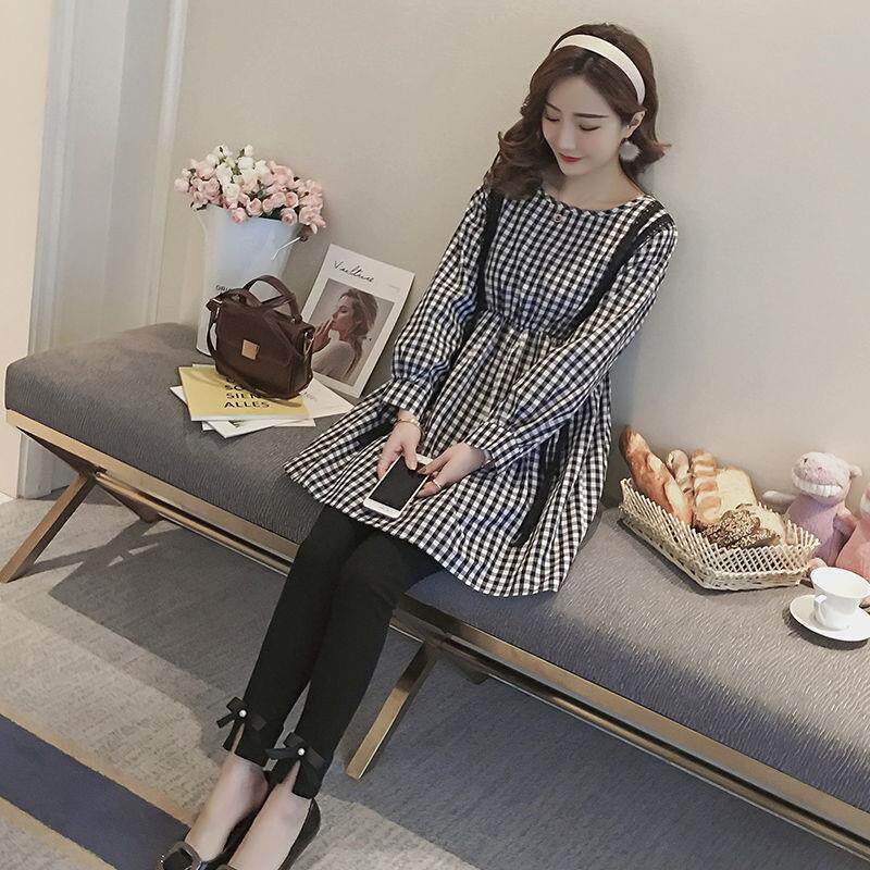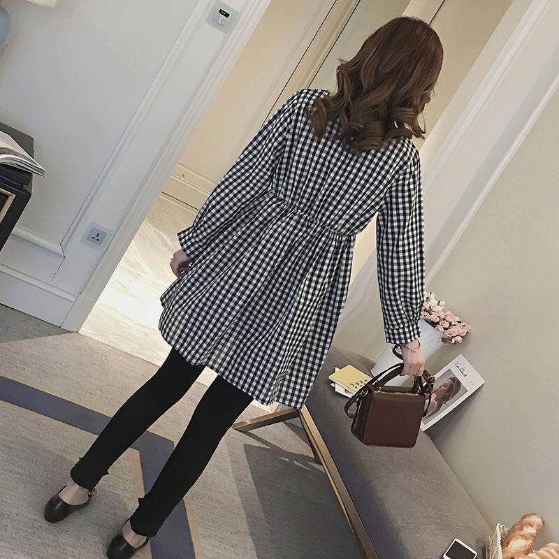 Pregnancy Maternity Dress 2022 Spring New Fashion Middle Long Version Cotton Linen Plaid Shirt Splicing Long-sleeved Pregnant Woman Ocean Wave