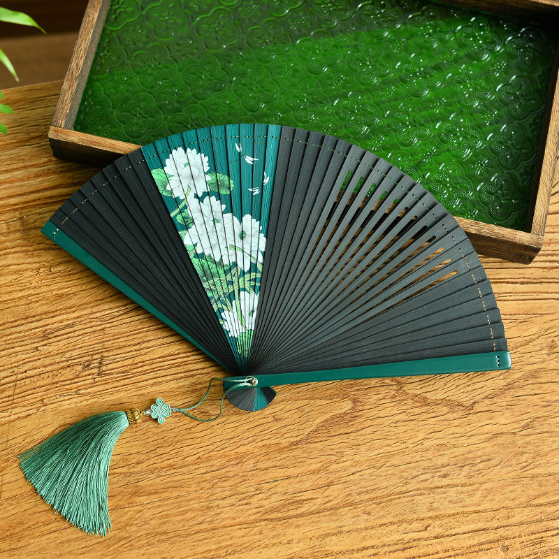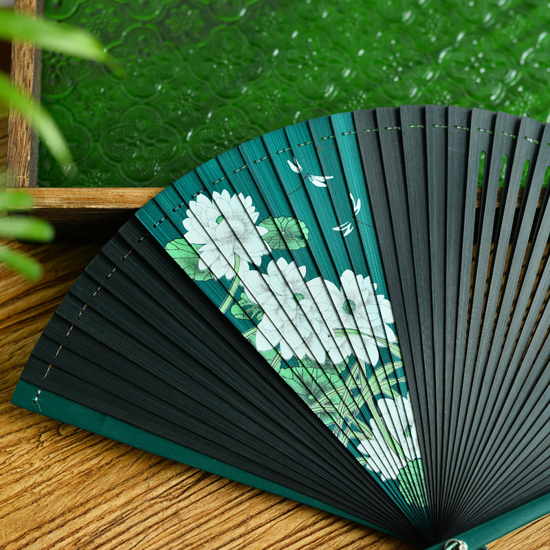 Ancient style folding fan dance with Japanese style Hanfu full bamboo and white lotus double-sided dance Chinese style retro cheongsam photo