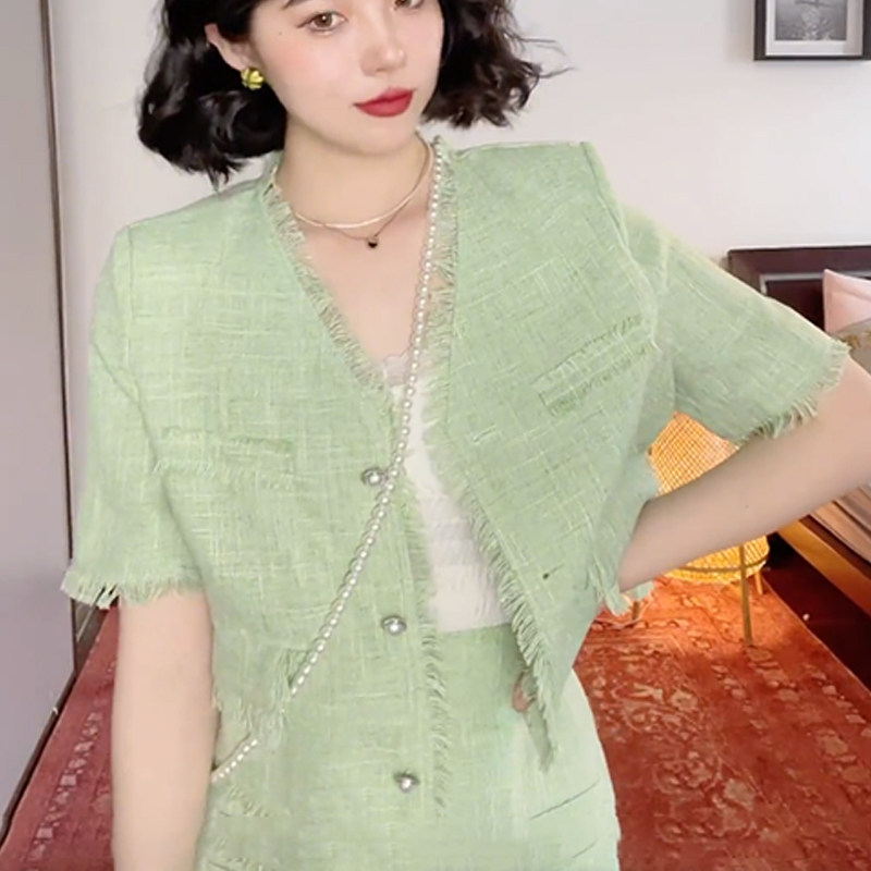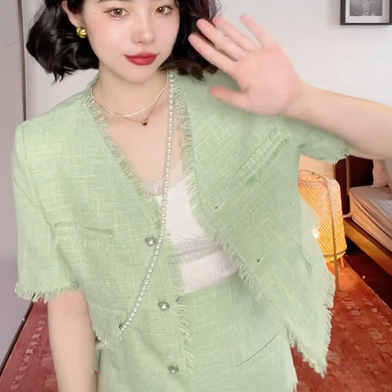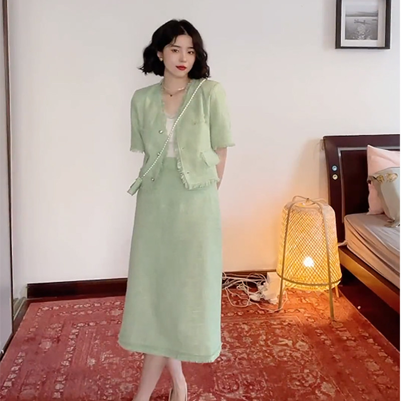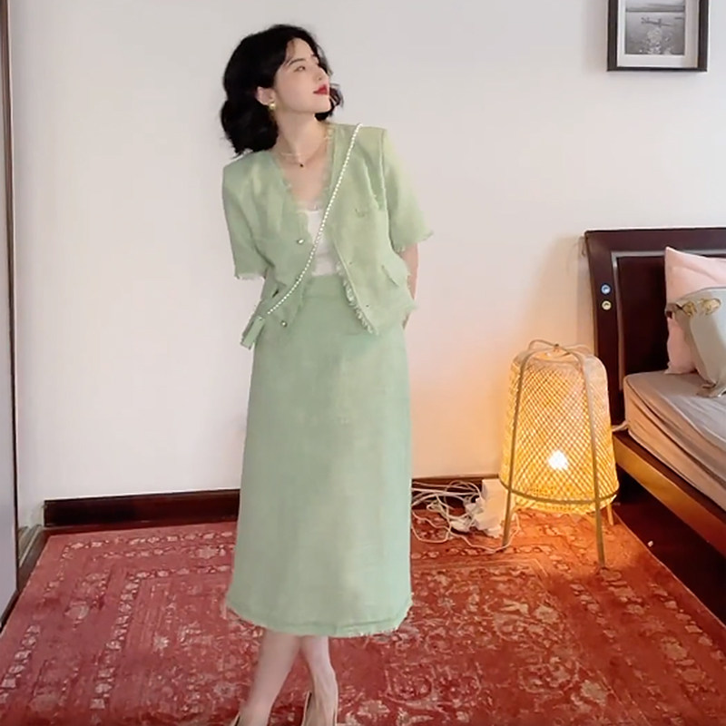 2022 Summer new female foreign pie light ripeness with small balsamic wind and short sleeve blouses superior 2-style suit skirt