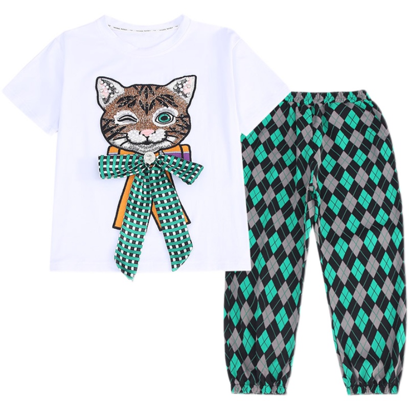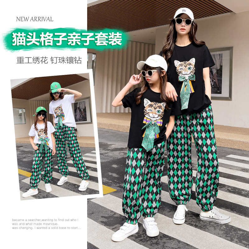 Frying Street Maternal and Women's Fashion Sleeve Green Glue Short Sleeved Parents and Child Embroidery Cartoon Ocean Two-piece Summer Suite