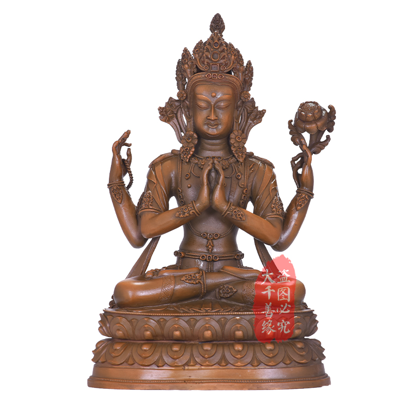 Great Thousand Good Non Heritage Ancient Method Red Copper 8 Inch 26cm Four-arm Guanyin Buddha statue Tibetan Buddhism BodhisattBodhisattva bronze statue swinging piece