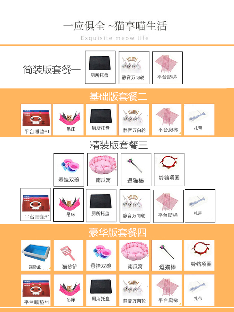 Package 1 (platform, ladder, wheel, tray) Package 2 (platform mat, hammock, strap set 1) Package 3 (pumpkin nest, cat teasing stick, etc. 10 pieces) Package 4 (cat litter box, cat litter shovel