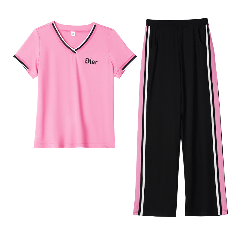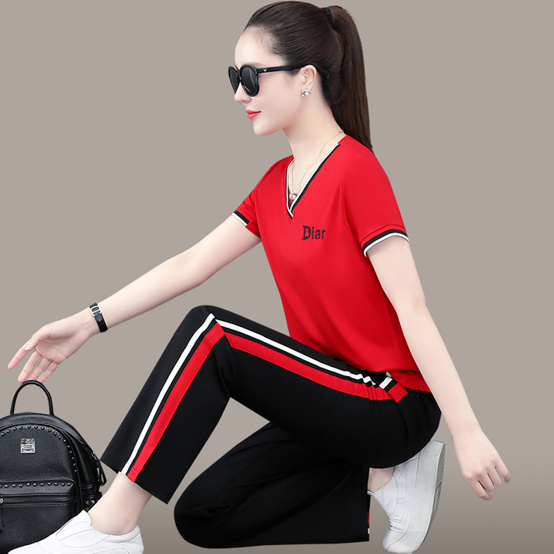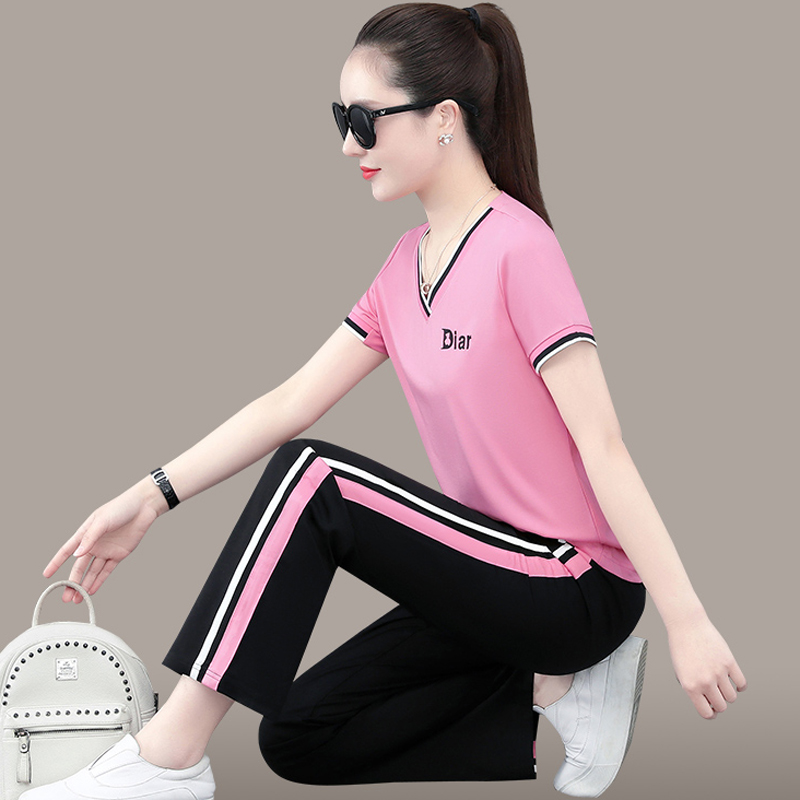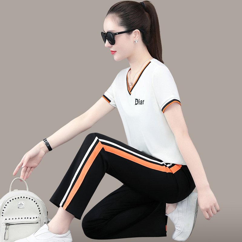 Sportswear Suit Lady Summer 2022 New Broadlegged Pants Short Sleeve V-collar Casual Wear embroidered running two-piece set