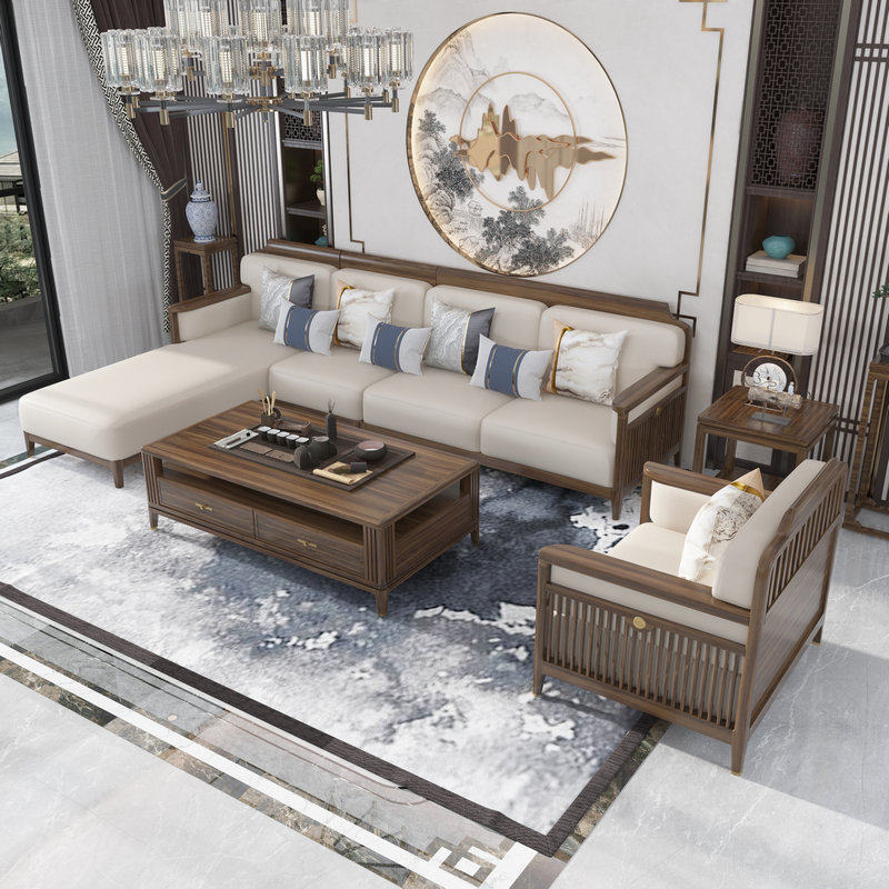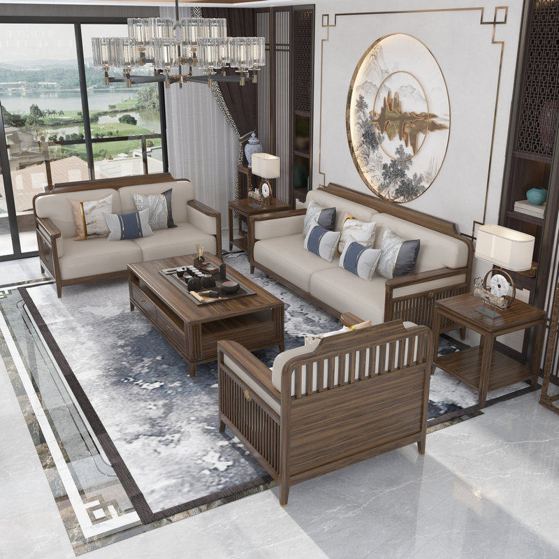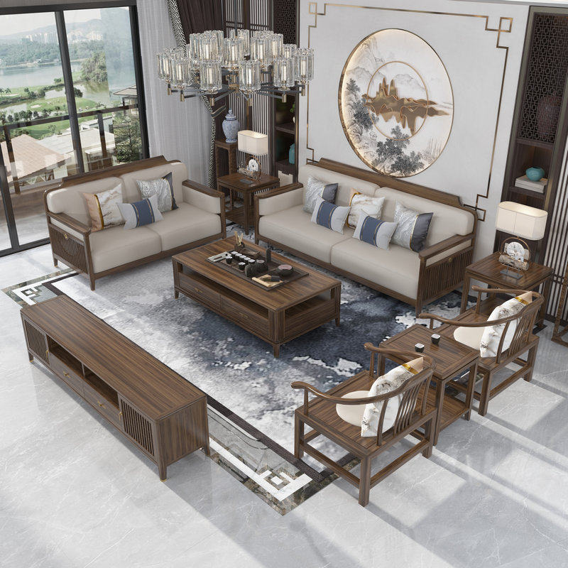 New Chinese style ebony wood sofa national tide simple light luxury leather art solid wood sofa combination villa living room high-end furniture