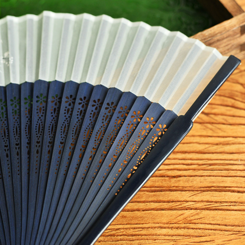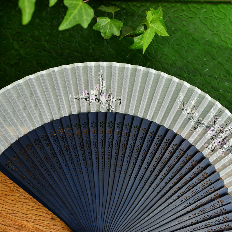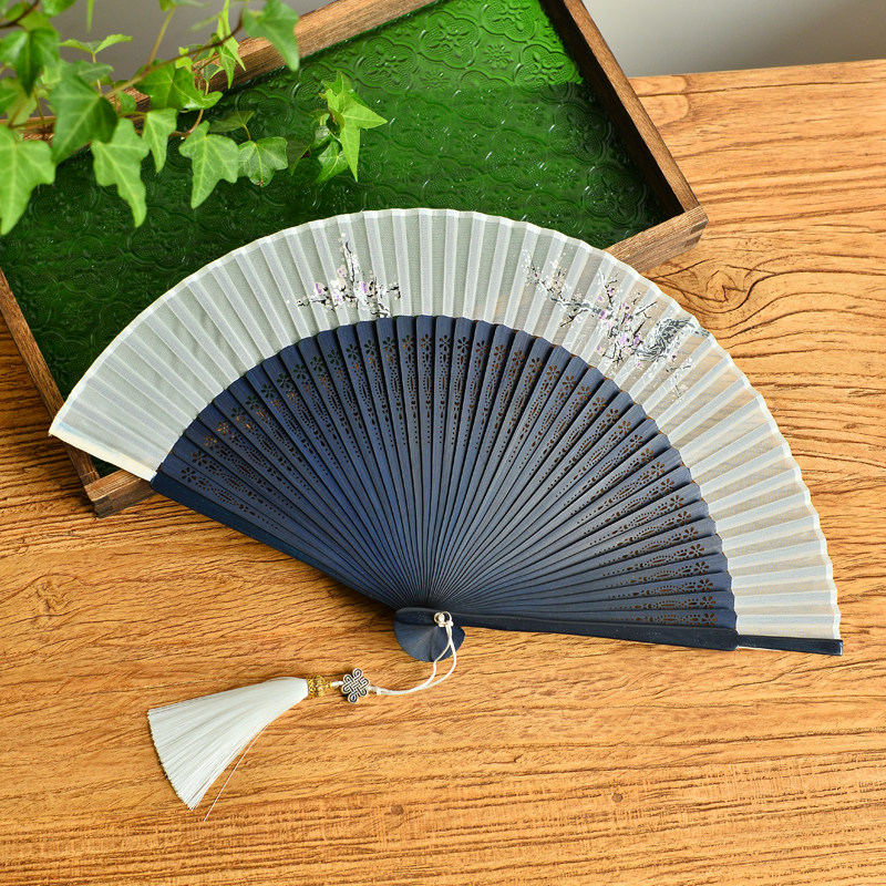 Blue bone simple elegant folding fan plum carving fan bone women's portable dance folding fan bamboo Hanfu cheongsam dance