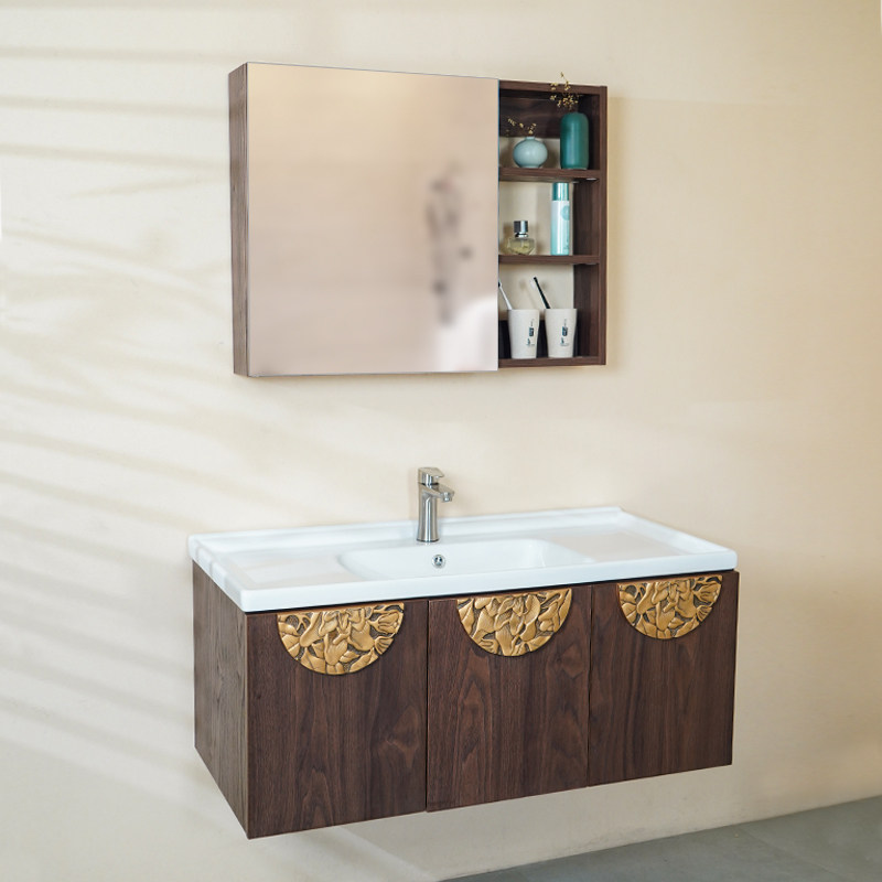 New Chinese minimalist bath Bathroom Cabinet Combo Retro Solid Wood Makeup Room Large Capacity Mirror Cabinet Washstand INTEGRATED CERAMIC BASIN