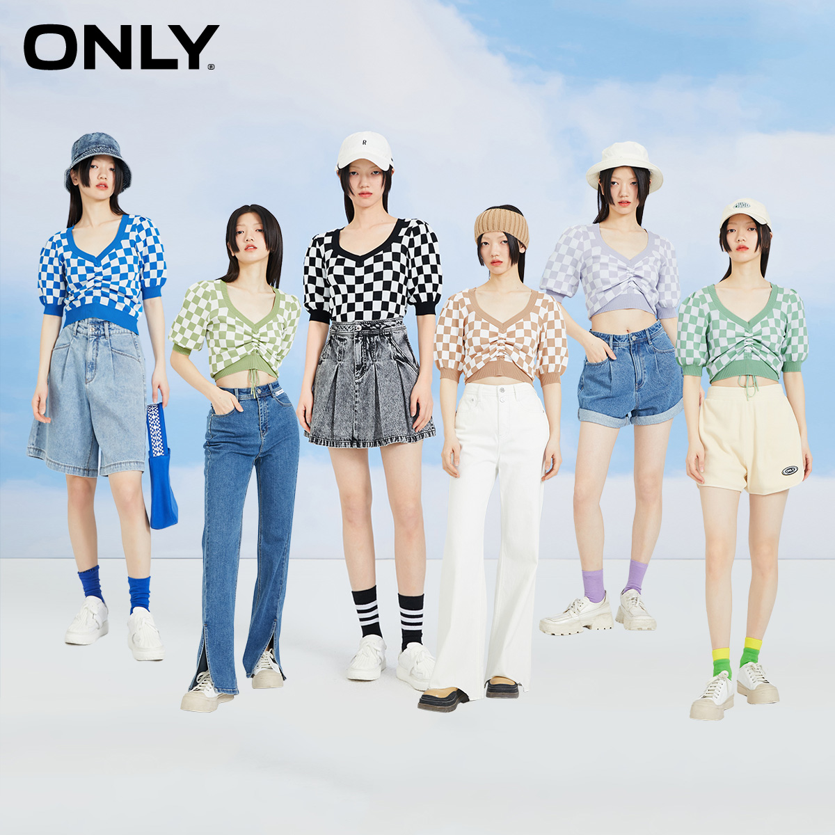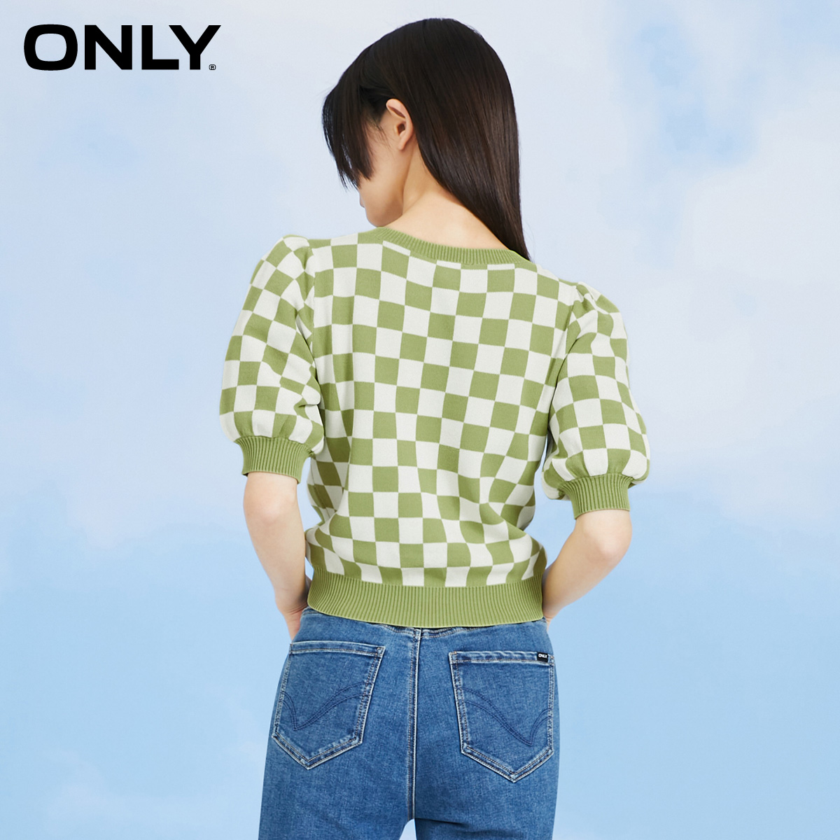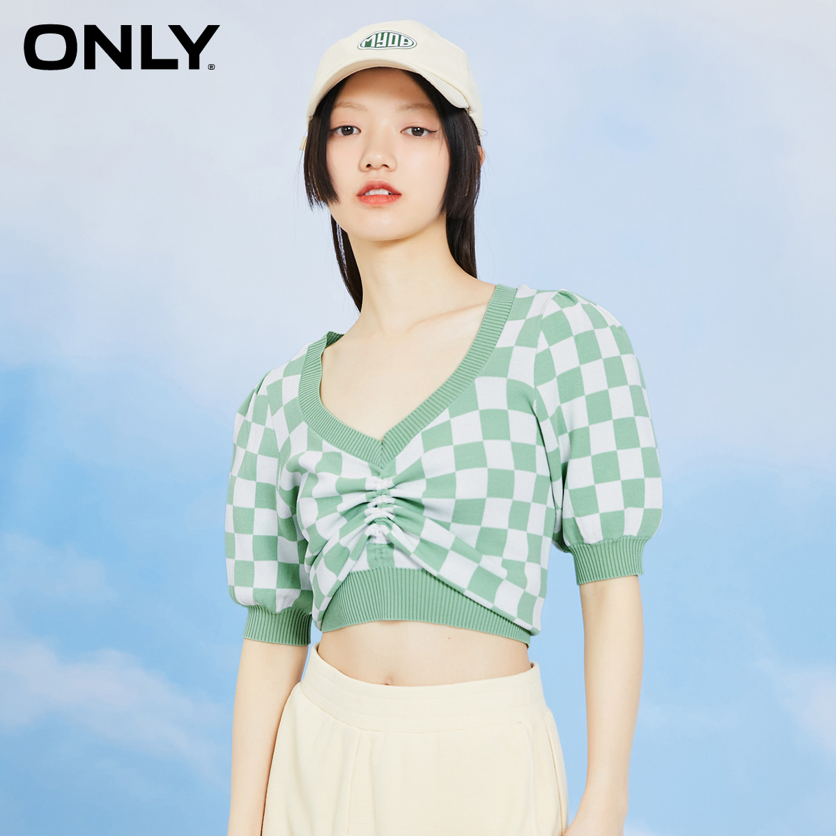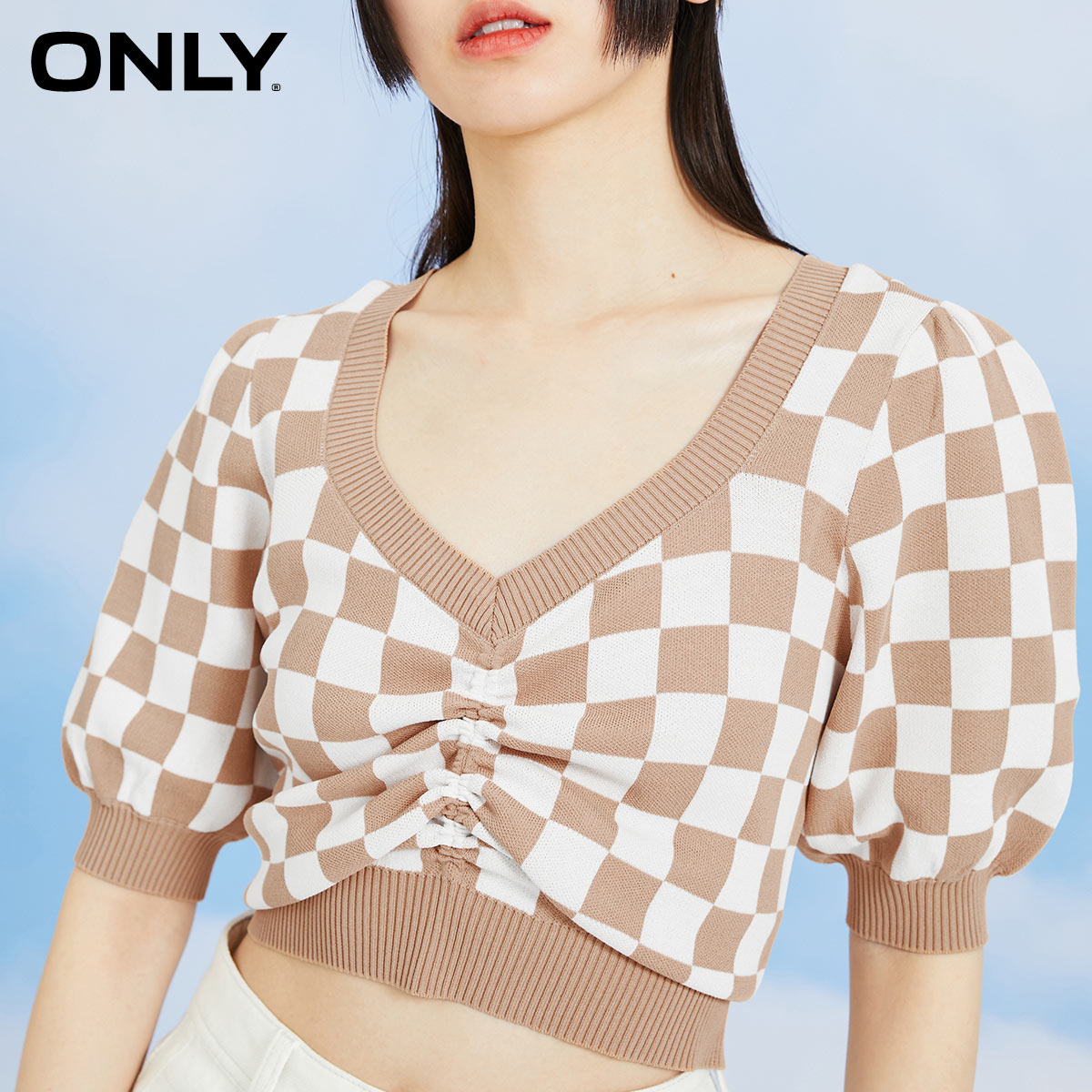 ONLY2022 summer new V-neck checkerboard design sense drawstring short-sleeved thin knitwear women) 122245001