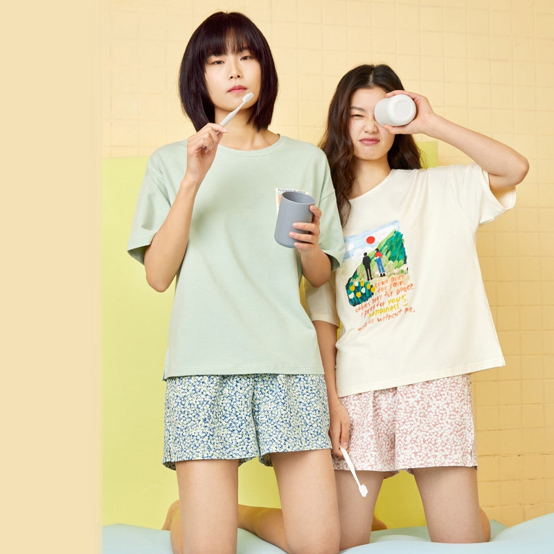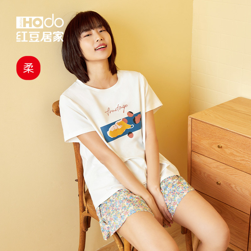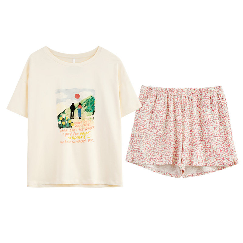 Red bean home spring summer cotton ladies pajamas short sleeve illustration print loose casual literary homewear set thin