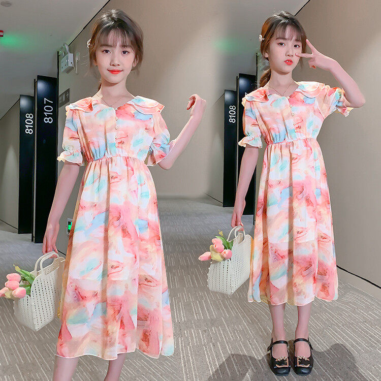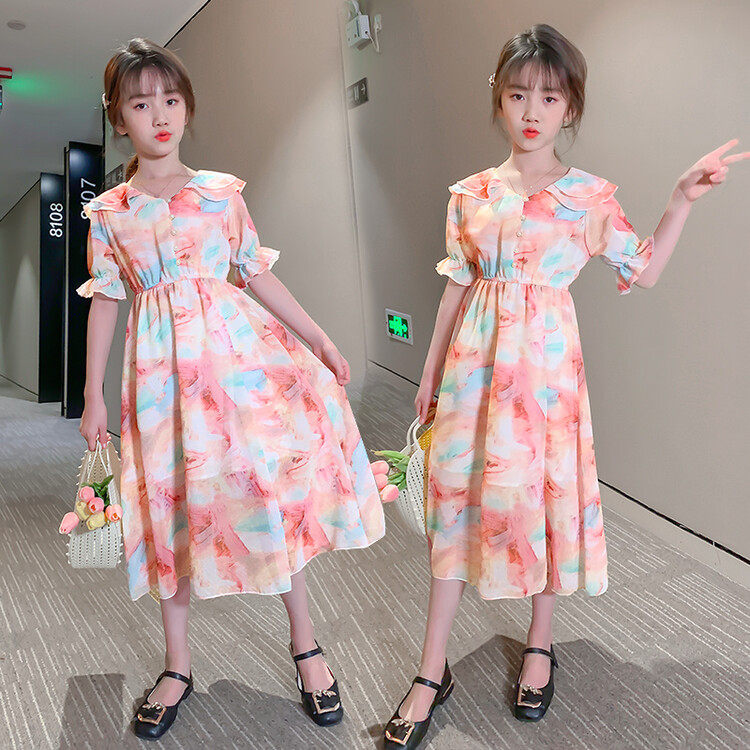 Girls' summer dresses New Western style middle-aged children's chiffon long skirts Versatile short-sleeved Korean version knee-length princess dresses