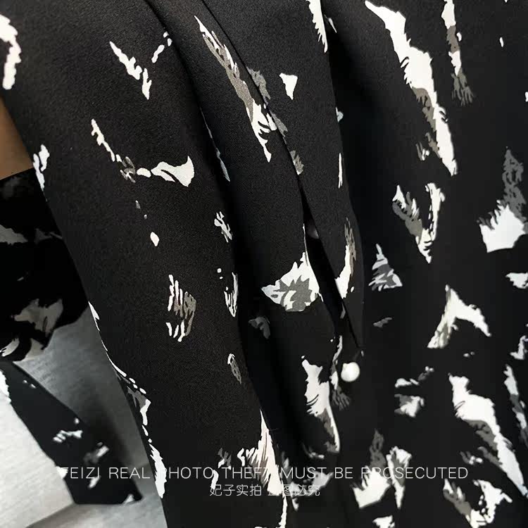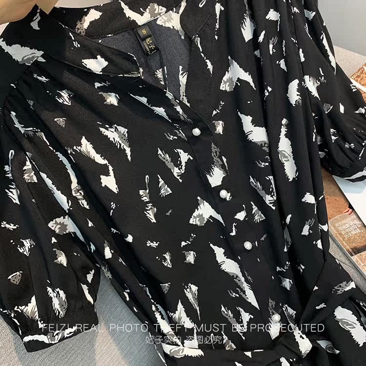 Ink print dress women's summer 2022 new fashion French style waist slim temperament mid-length skirt floral skirt