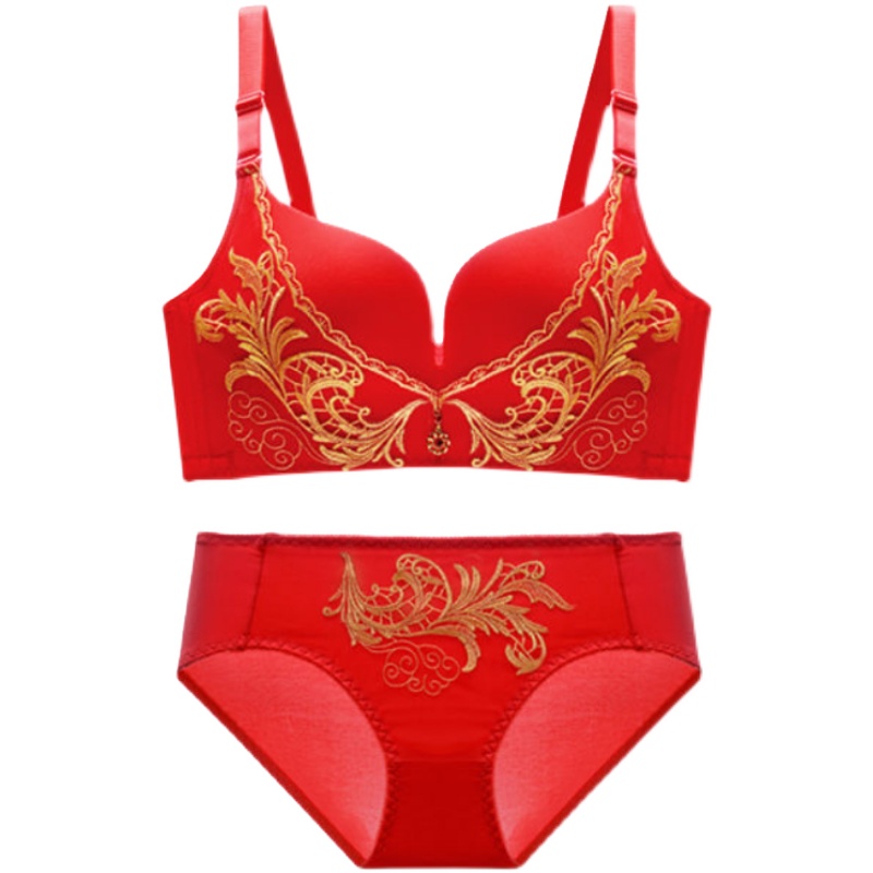 High-grade Benming year big red underwear V-shaped embroidery without steel ring gathering and collecting pair of breasts Phoenix underwear suit ladies