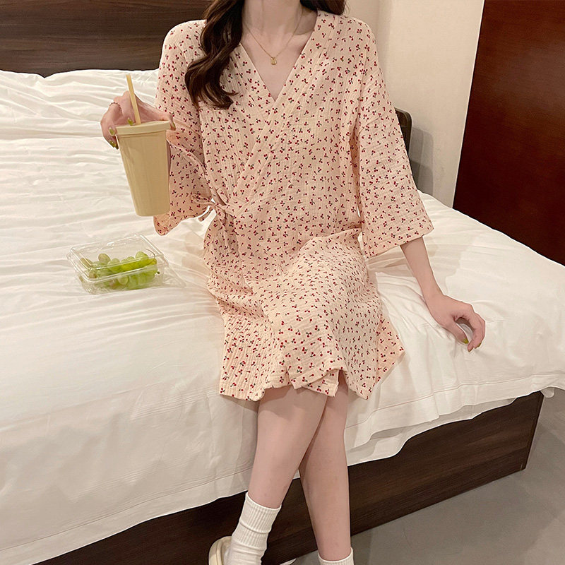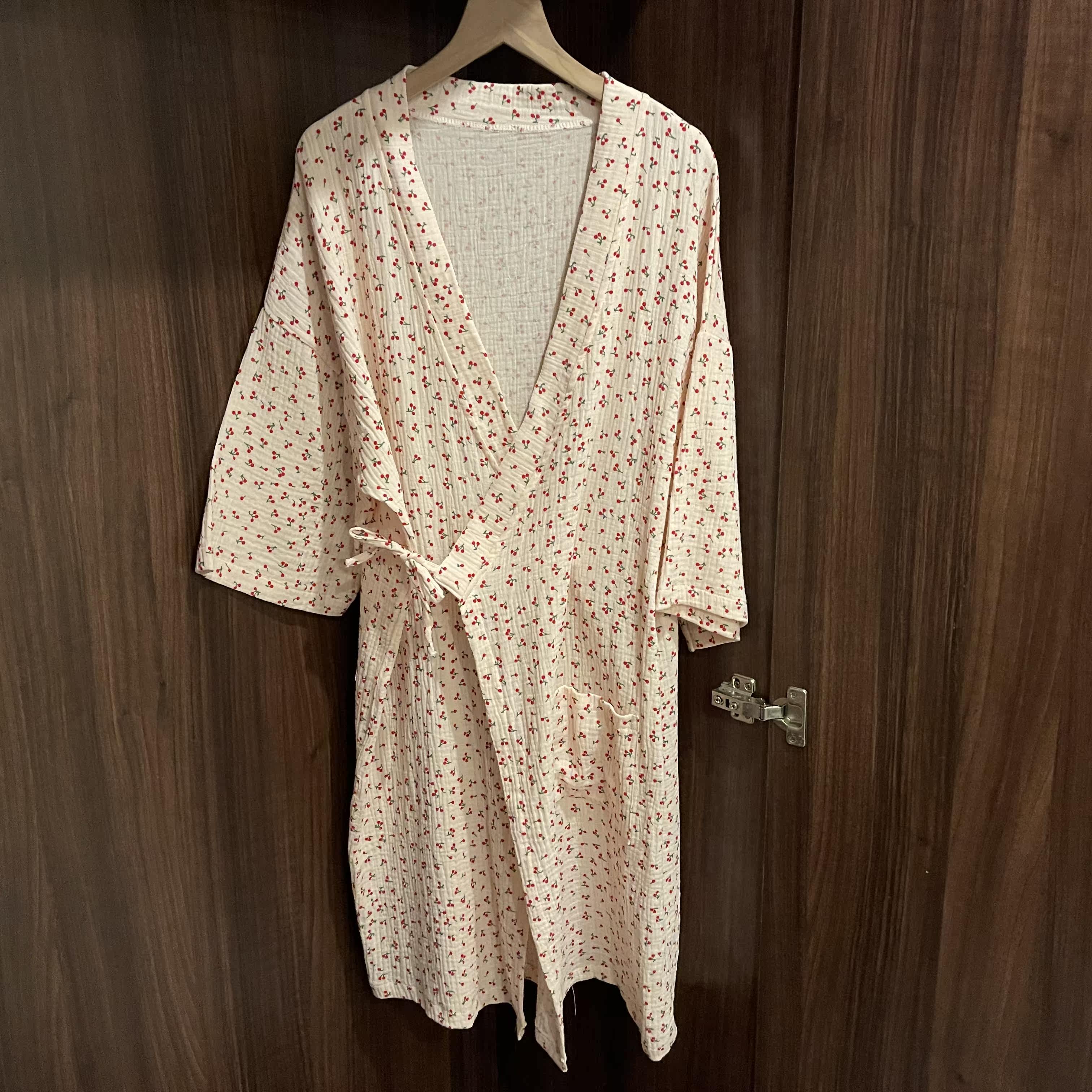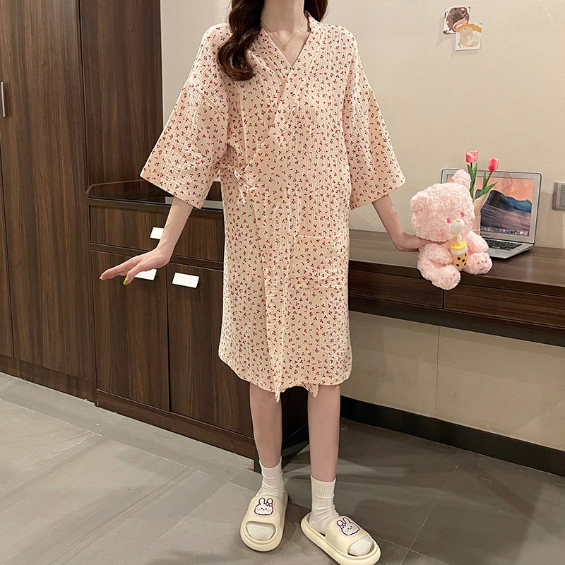 Summer thin sweet small floral dressing gown female Japanese kimono cotton gauze nightgown loose bathrobe absorbent quick-drying