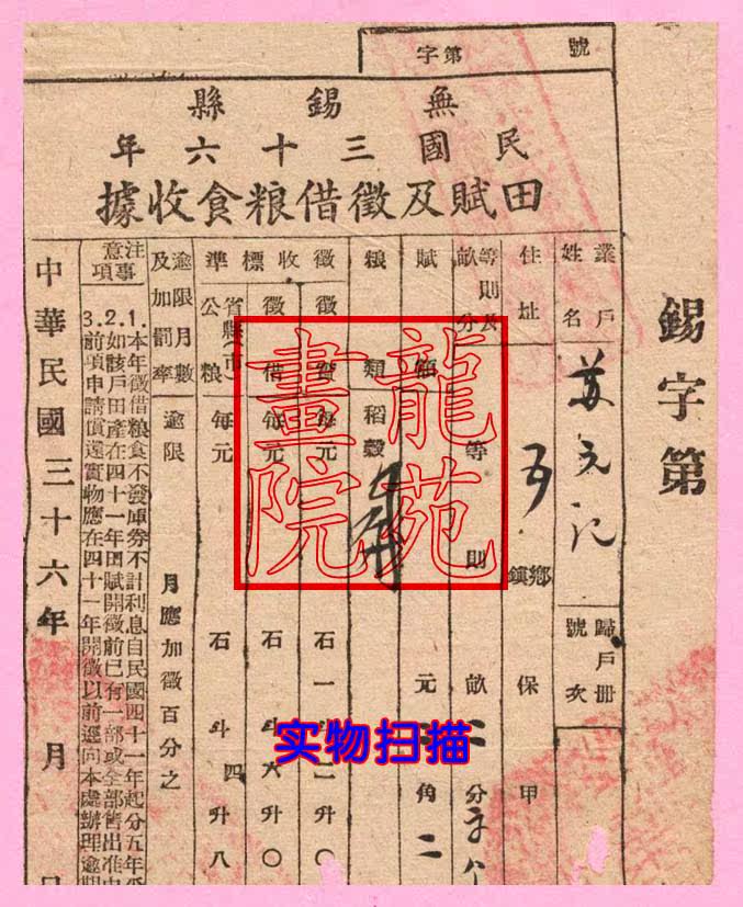 Wuxi County Republic of China 36 Years of "Tanfu and Borrowed Grain Receipt" Tax Historical Materials Agricultural Tax Bills 1947