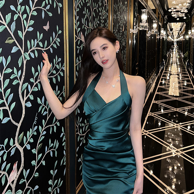 nicky Reba with the same style high-end green hanging neck temperament dress female acetate satin 2022 new spring and autumn