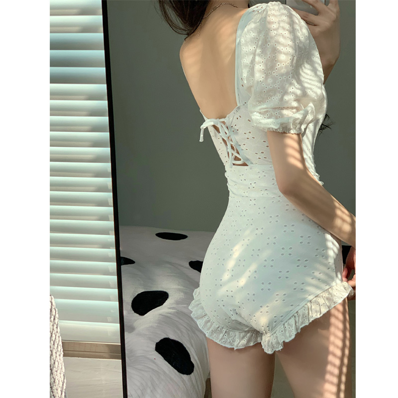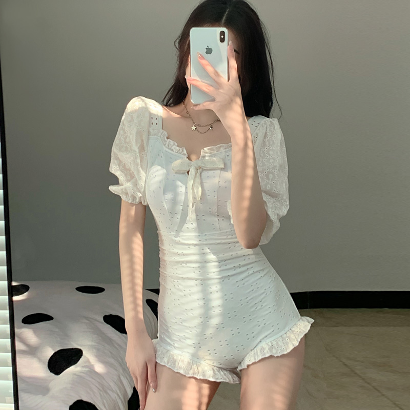 Swimsuit female hot spring conservatively gathered 2022 new fairy fan one-piece short-sleeved belly cover thin student boxer swimsuit