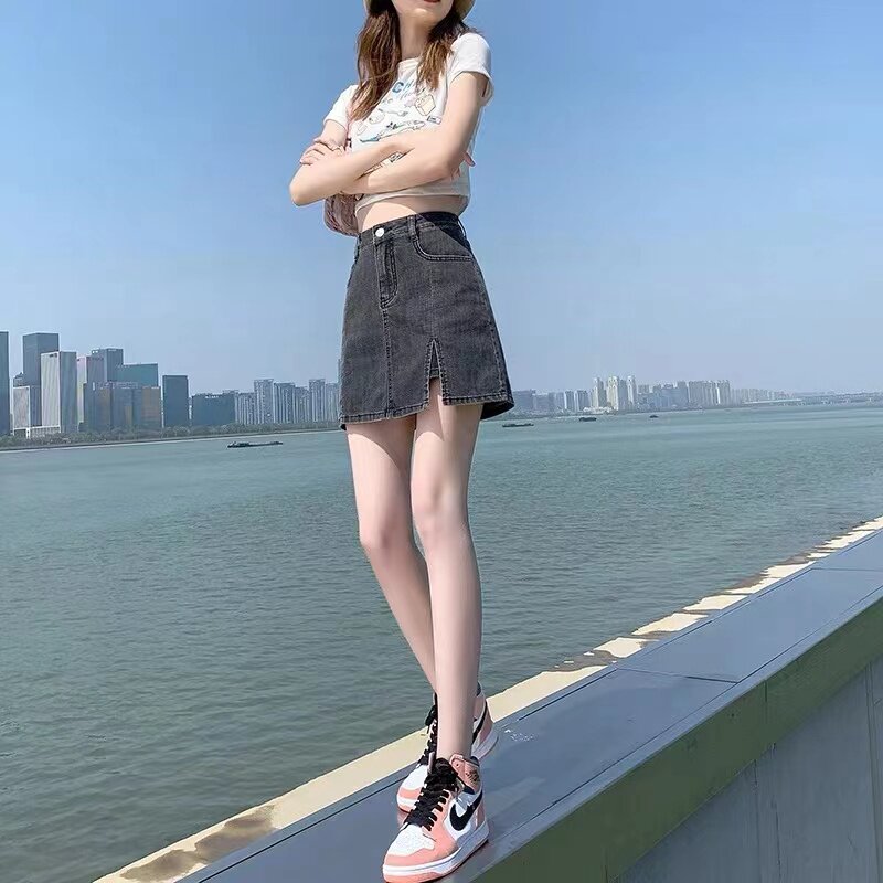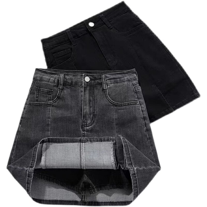 Korea 2022 Summer Elastic Denim Skirt Half Body Skirt Woman High Waist Anti Walking Light Bag Hip Skirt Open Fork a pair of short skirts