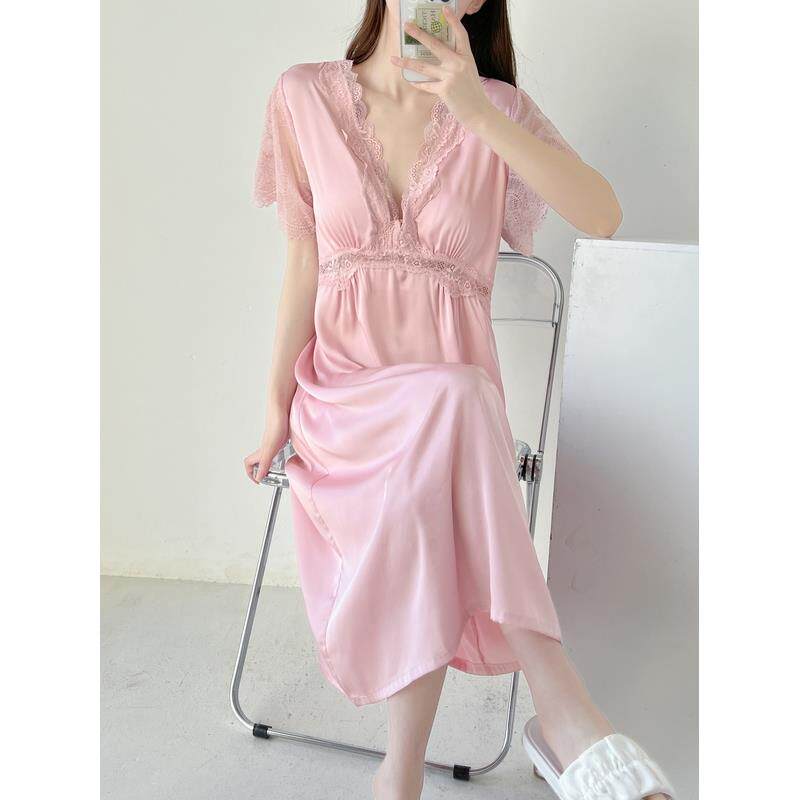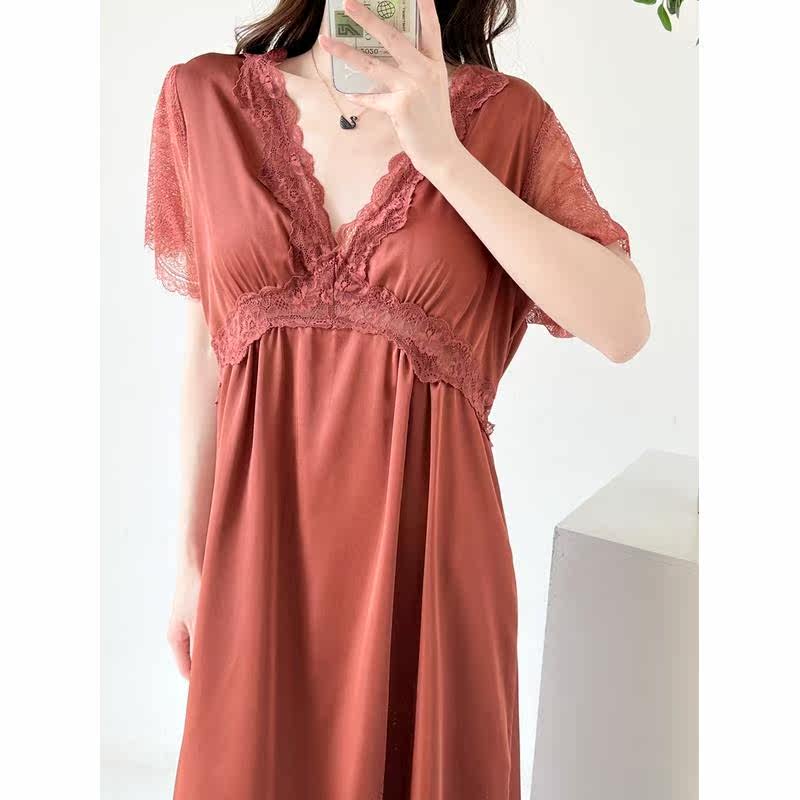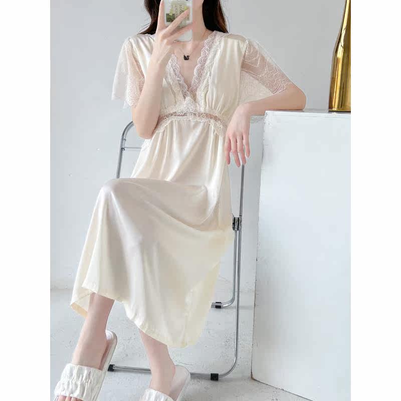 2022 spring and summer sexy pajamas season hot style ice silk nightdress with chest pad lace hollow short-sleeved long skirt home service