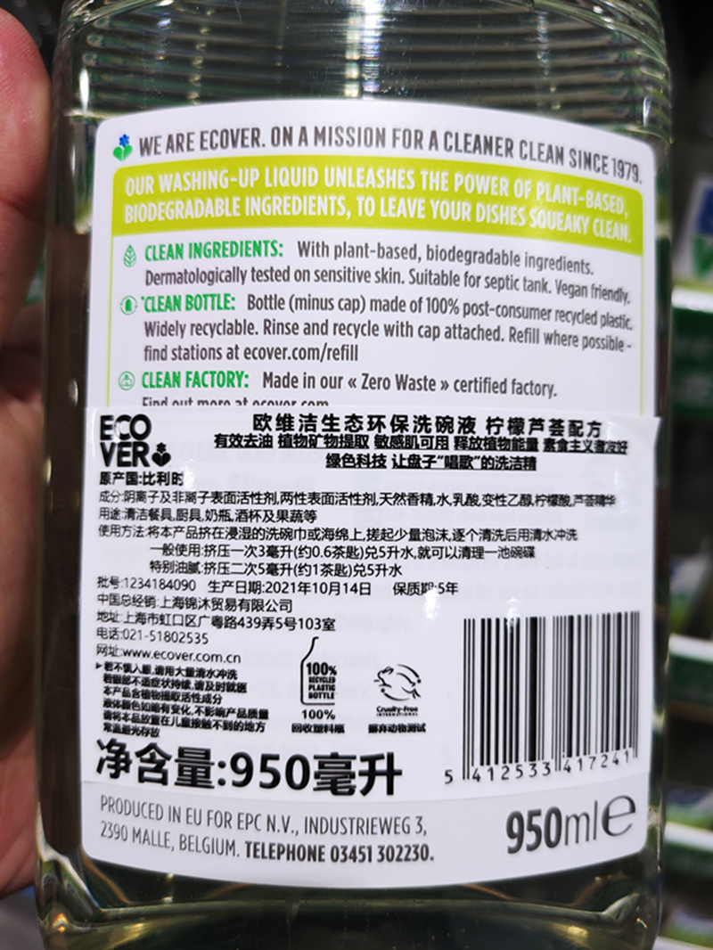 Shanghai open city guest costco Belgium ECOVER EU Ecological and eco-friendly dishwashing liquid 950mlx3