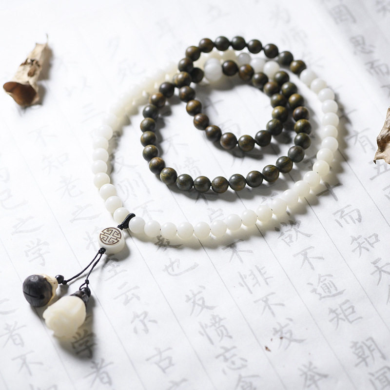 Chinese Wind Foal Department Handmade Multi Circle White Jade Bodhi Root Green Sandalwood 8mm Handstrings Necklace Wool necklace Men and women