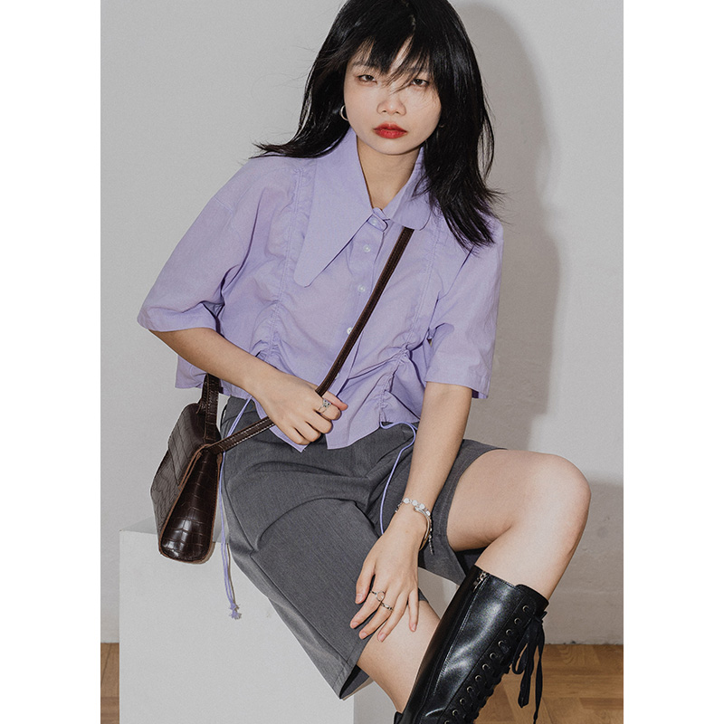 Design sense Pleats Short Sleeve Shirt Woman Summer New Asymmetry Flip Collar Loose 100 Lapped Short blouse