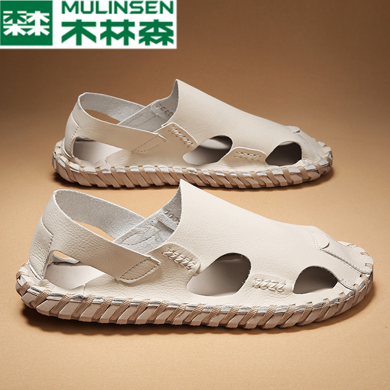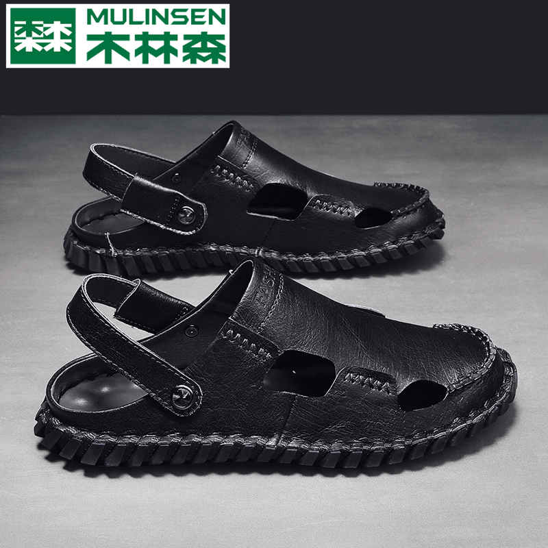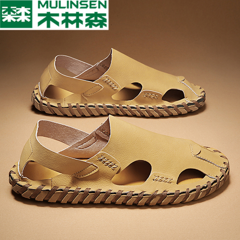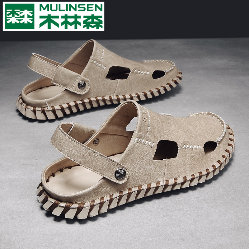 Wood Linson Leather Sandals Boys Genuine Leather Casual Driving Dual-use Baotou Cold Tug Summer Outside Wearing Non-slip Sports Beach Shoes