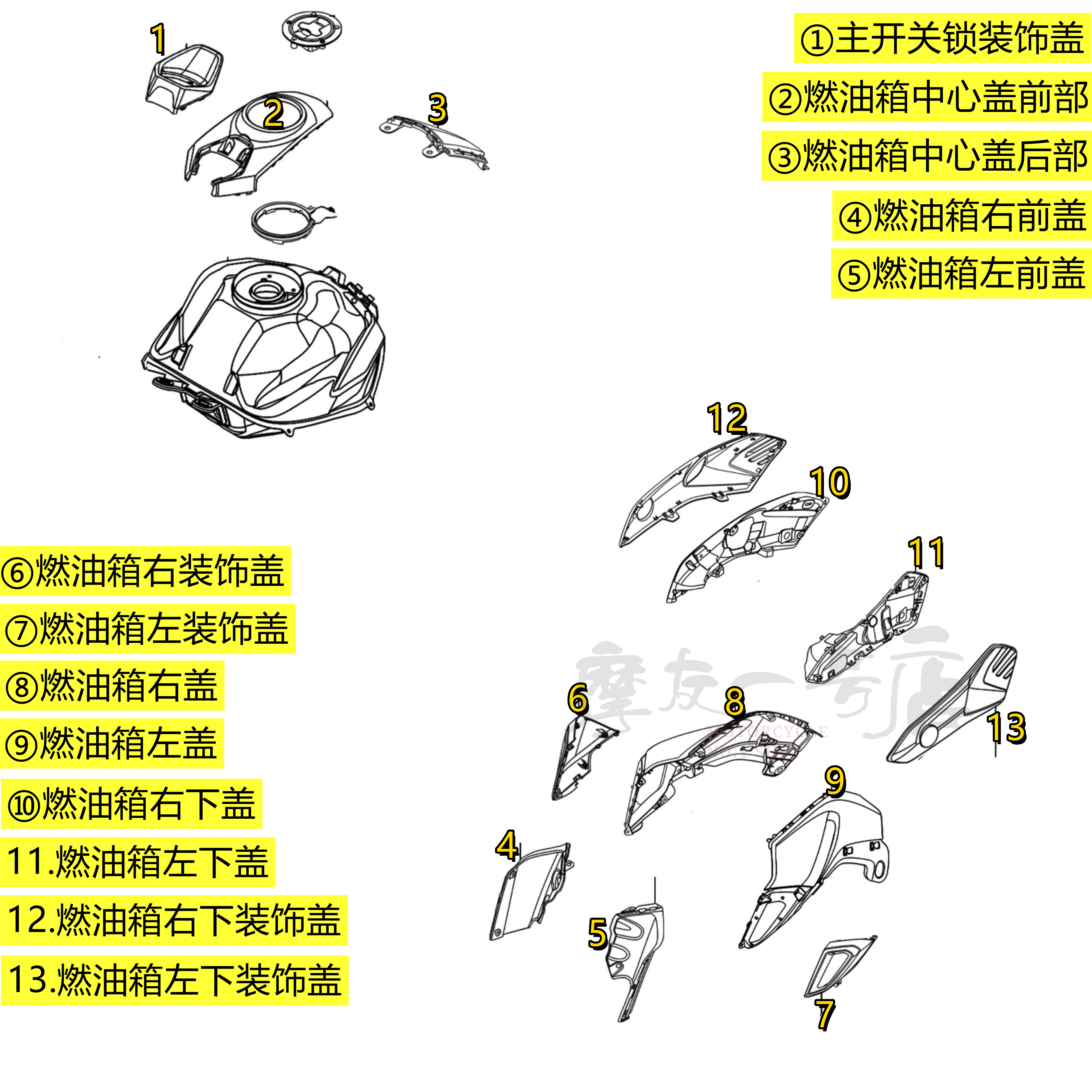 1 Main switch lock decorative cover 2 Front fuel tank center cover 3 Fuel tank center cover rear (star black) 3 Fuel tank center cover rear (Windsor Blue) 3 Fuel tank center cover rear (Diamond Leopard red)