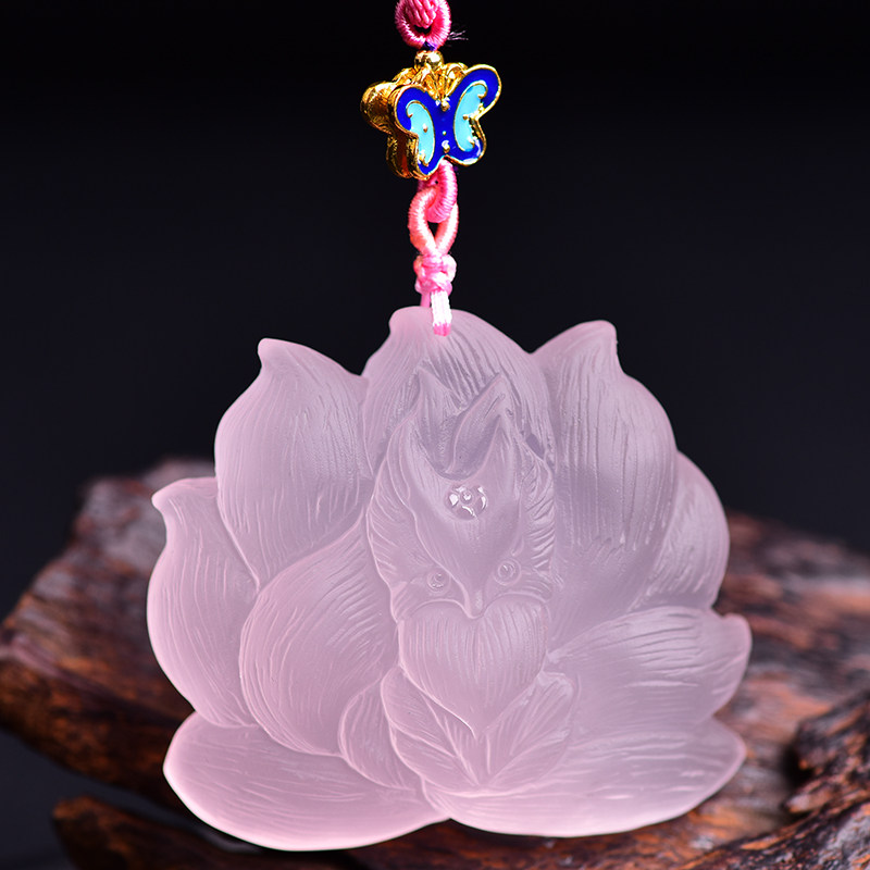 Atmospheric Fine Carving Natural Powder Crystal Pendant Nine Tailed Fox Hibiscus Crystal Pink Crystal Necklace Ornament Gift Woman