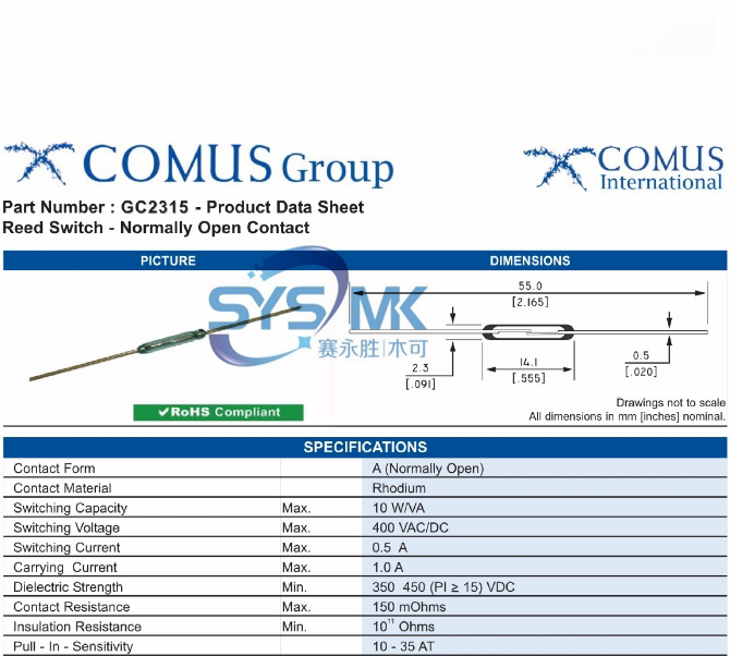 GC2315 COMUS Dutch small high-voltage dry reed switch withstand voltage 400V 0 5A magnetic control switch magnetic reed switch
