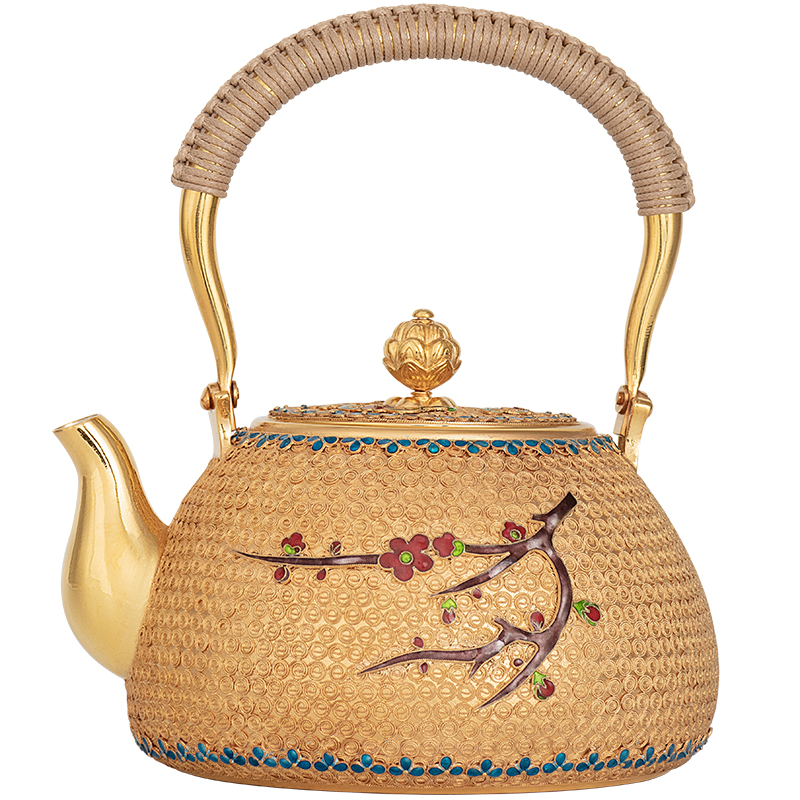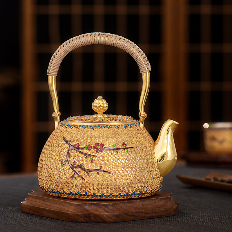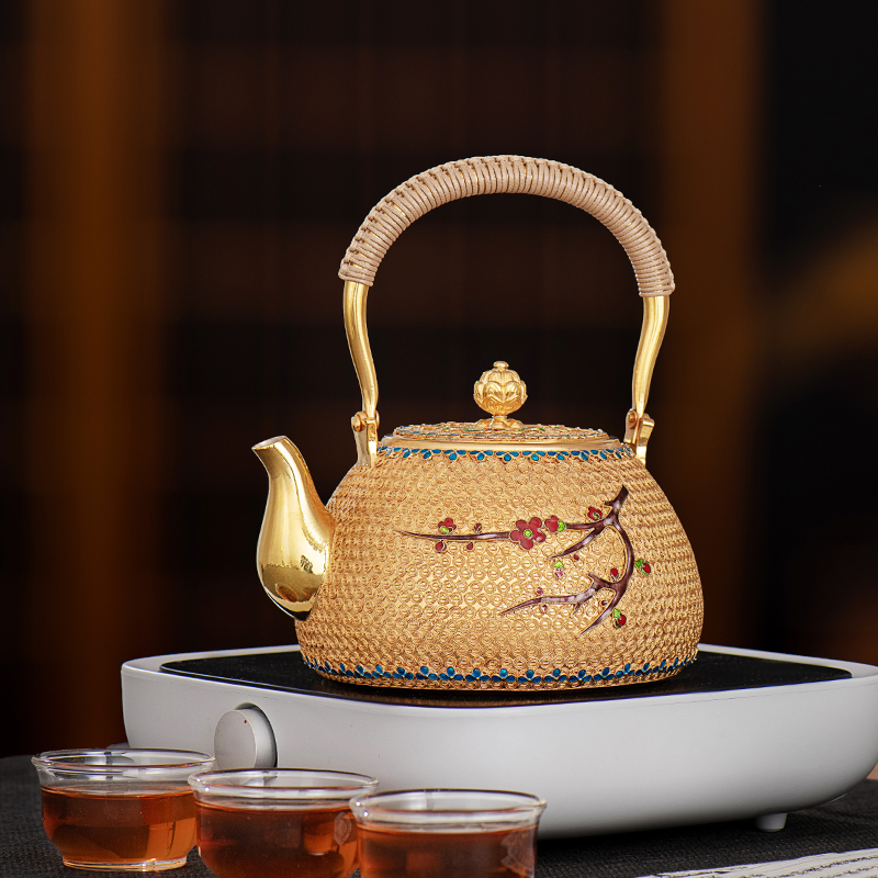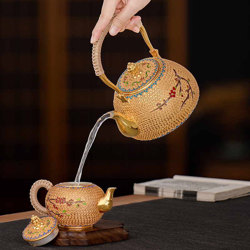 Silver Age Sterling Silver 999 Kettle Filigree Plum Blossom Boiling Kettle Chinese Court Style Home Gilded Gold and Silver Teapot