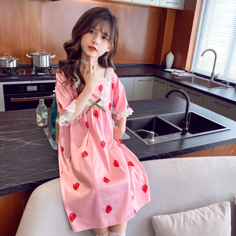 Girls' nightdress summer ice silk 2022 new skirt children's summer girl thin section short-sleeved princess wind pajamas summer