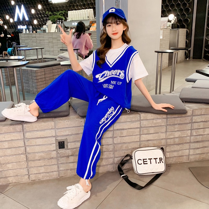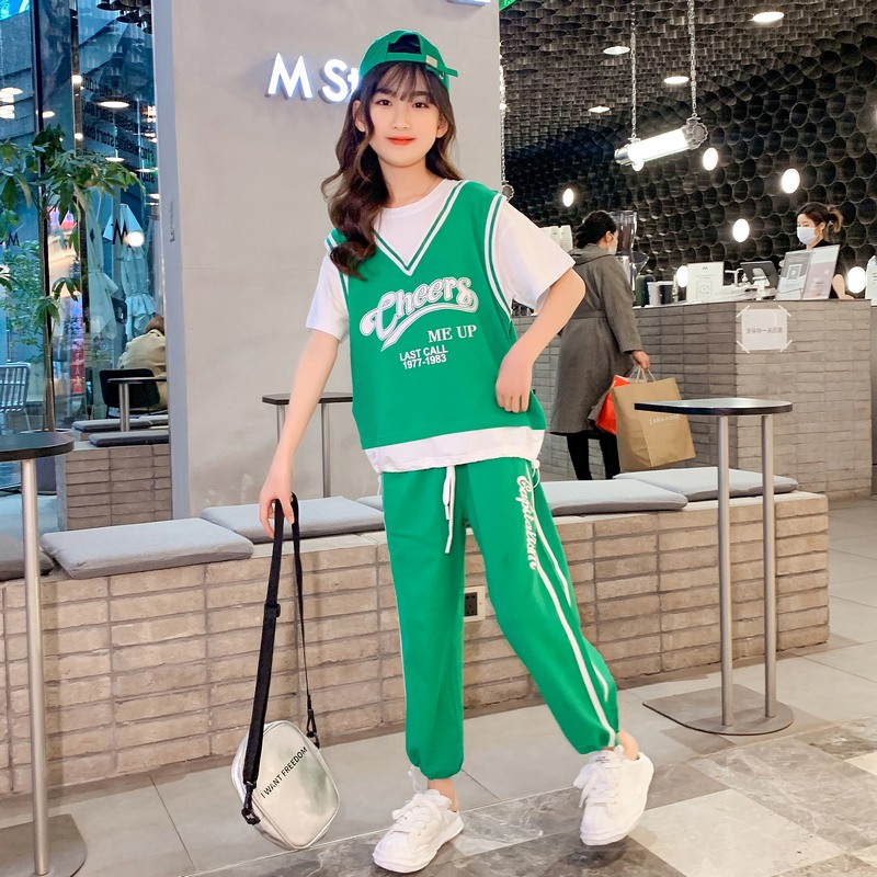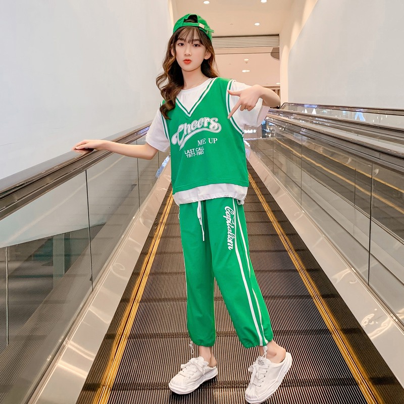 Girl Summer Dress Trendy Children Suit Short Sleeve Big Boy Nets Red 2022 New Foreign Pie Girl Clothes Summer Two Sets