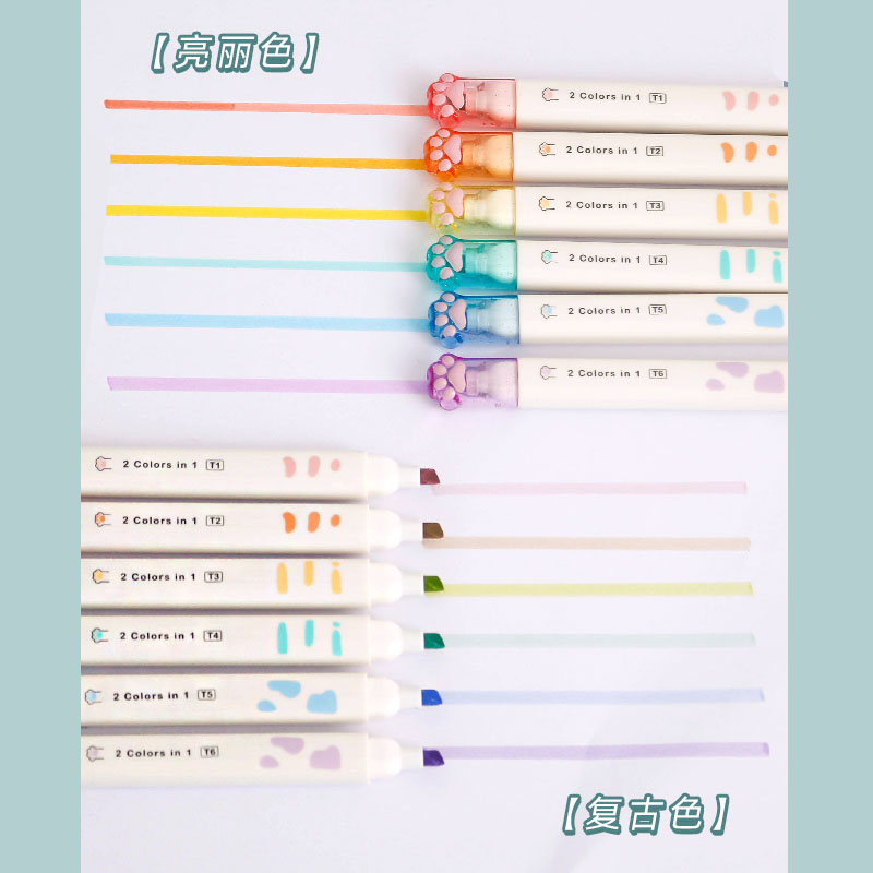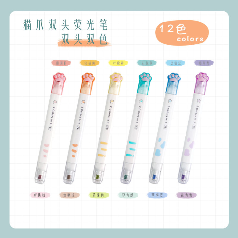 Cat Paw Bicolor Fluorescent Marker Pen Elementary School Students With Colored Marking Pen Water-based Pen Color Series Axe Type Fine Head Large Capacity