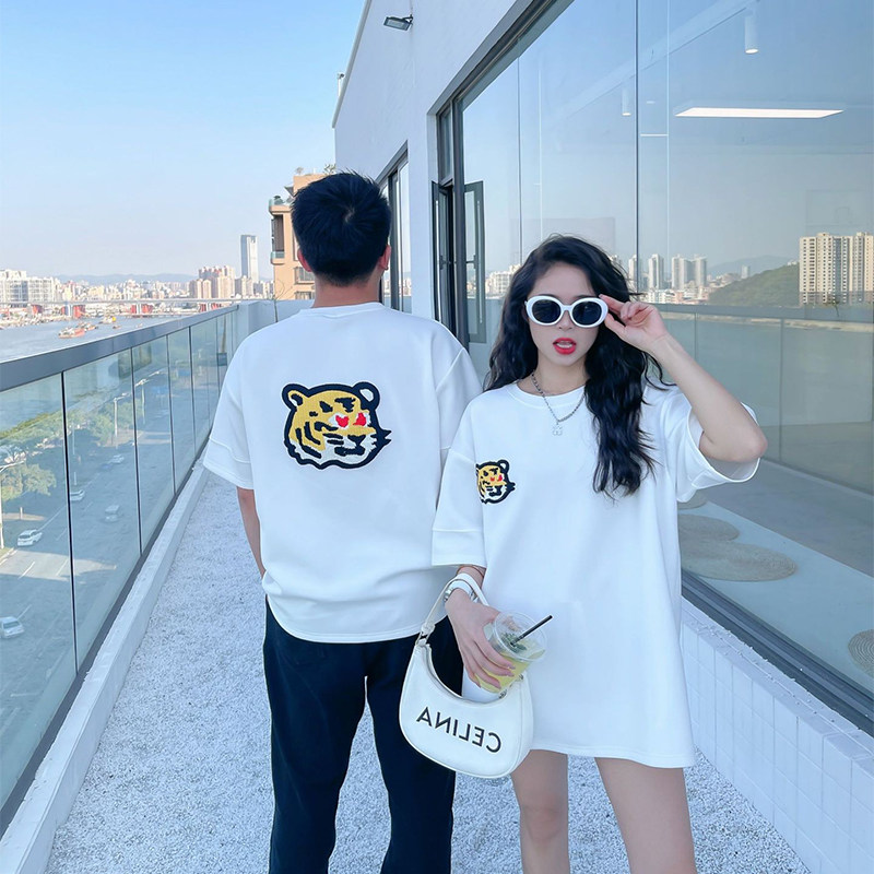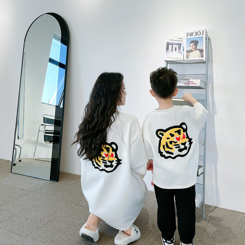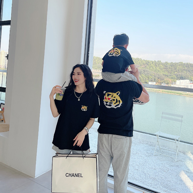 Parent-child summer dress family three short sleeves T-shirt new trend children cartoon embroidery tiger head mother and daughter dress foreign pie