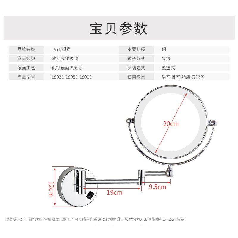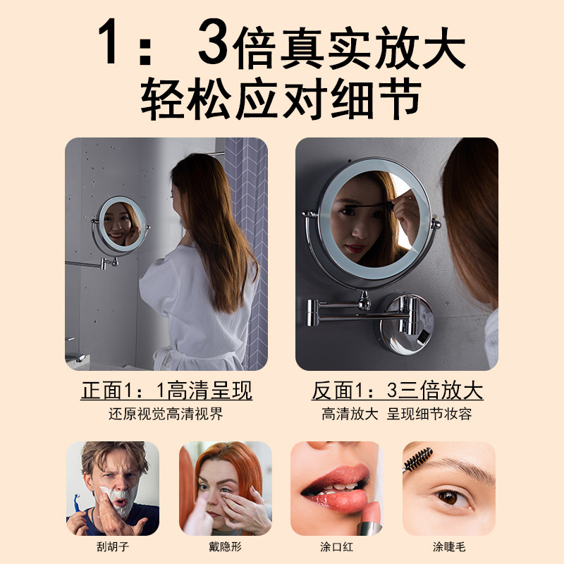Bathroom rechargeable led folding wall-mounted make-up mirror with lamp retractable dressing room with wall double-sided magnifying glass