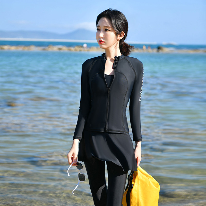 Long sleeve swimsuit woman dress style two-piece long pants sunscreen nylon speed dry black display slim large size diving suit jellyfish spa