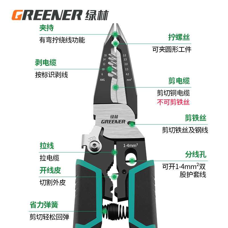 Green Forest 9 in 1 multifunctional tip pliers electrician special pliers industrial grade labor-saving stripping pliers cable pliers Taiwan