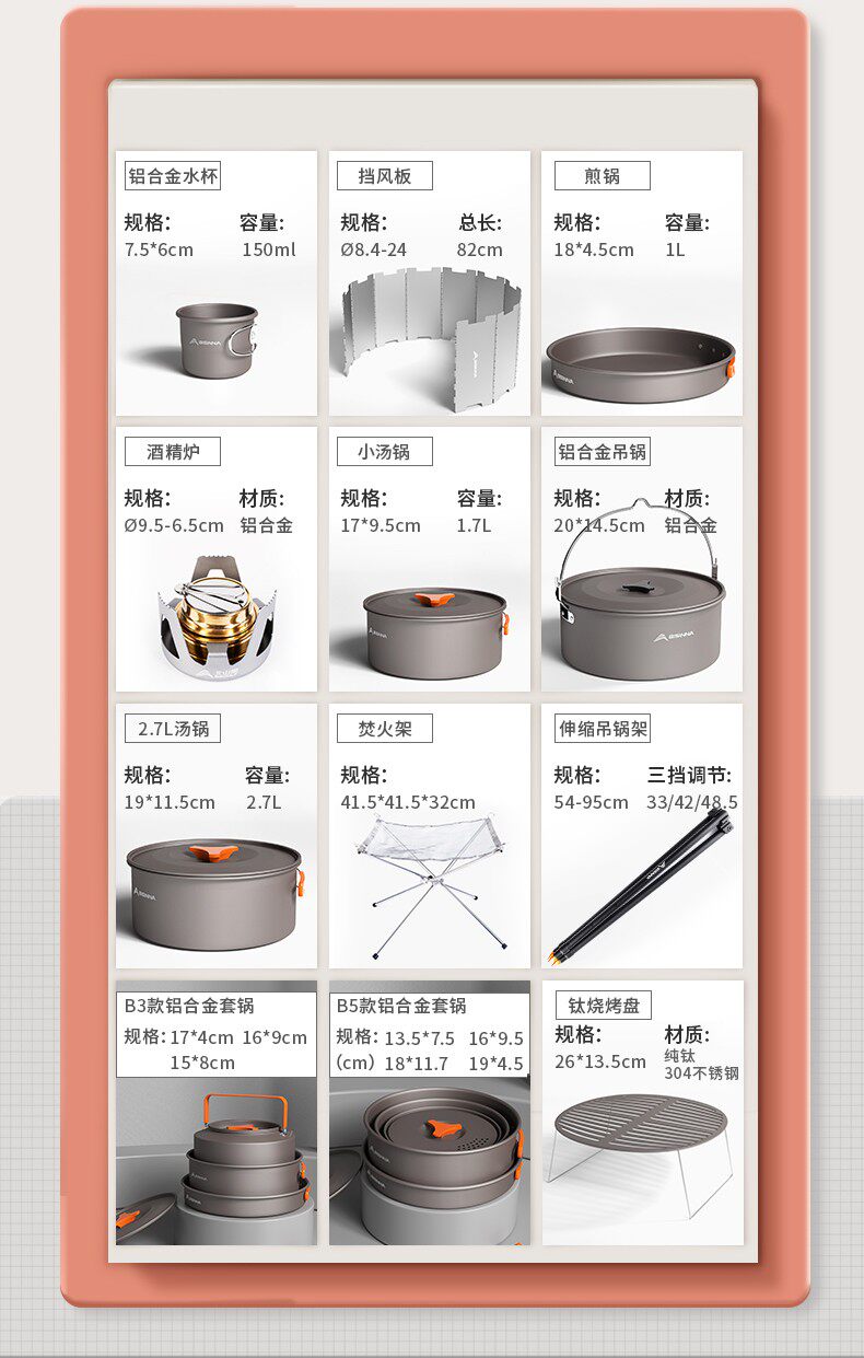 B5 aluminum alloy set pot 150ML aluminum alloy water cup frying pan alcohol stove small soup pot big soup pot hanging pot fire rack telescopic hanging pot rack titanium barbecue plate windshield